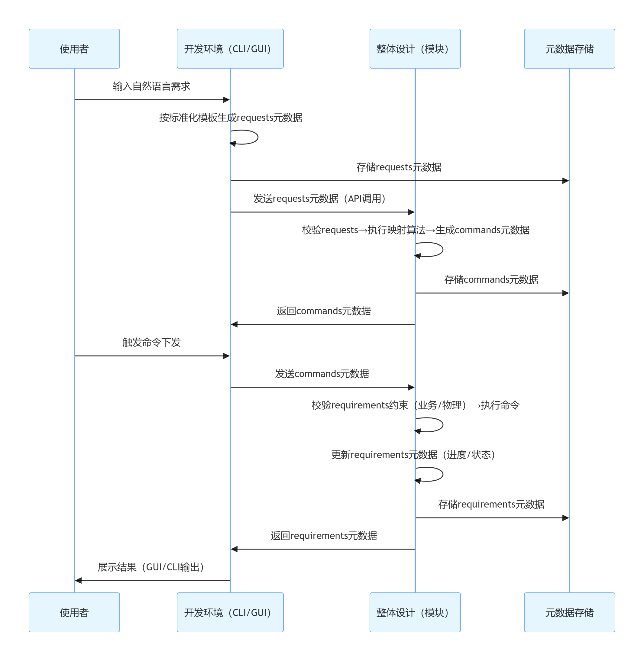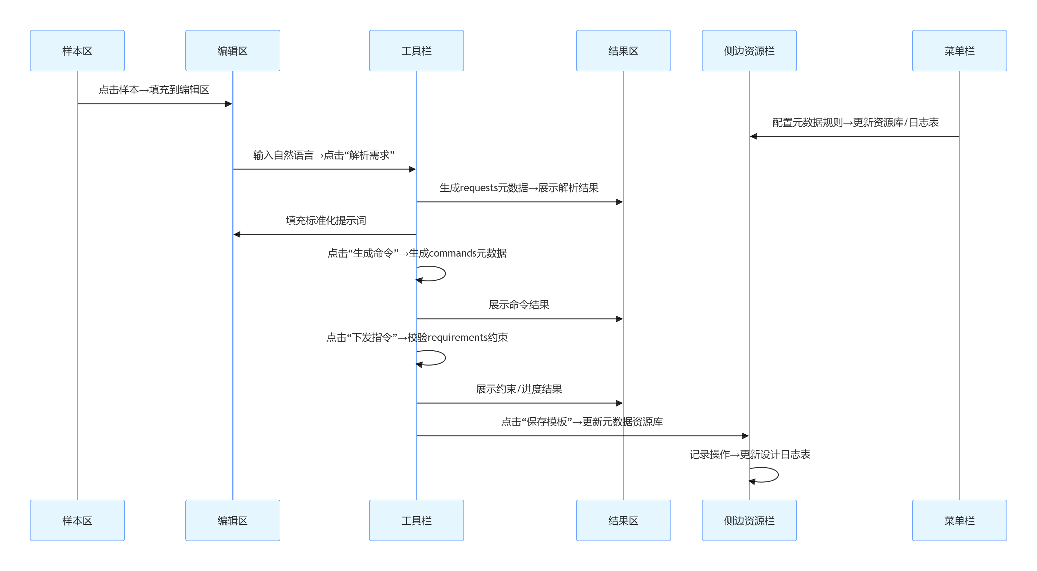 | ① 元数据模板 APP | 设计系统顶部(默认展开) | - 可视化编辑requests/commands/requirements Schema- 上传 / 下载 / 预览模板文件- 版本管理与回滚 |
