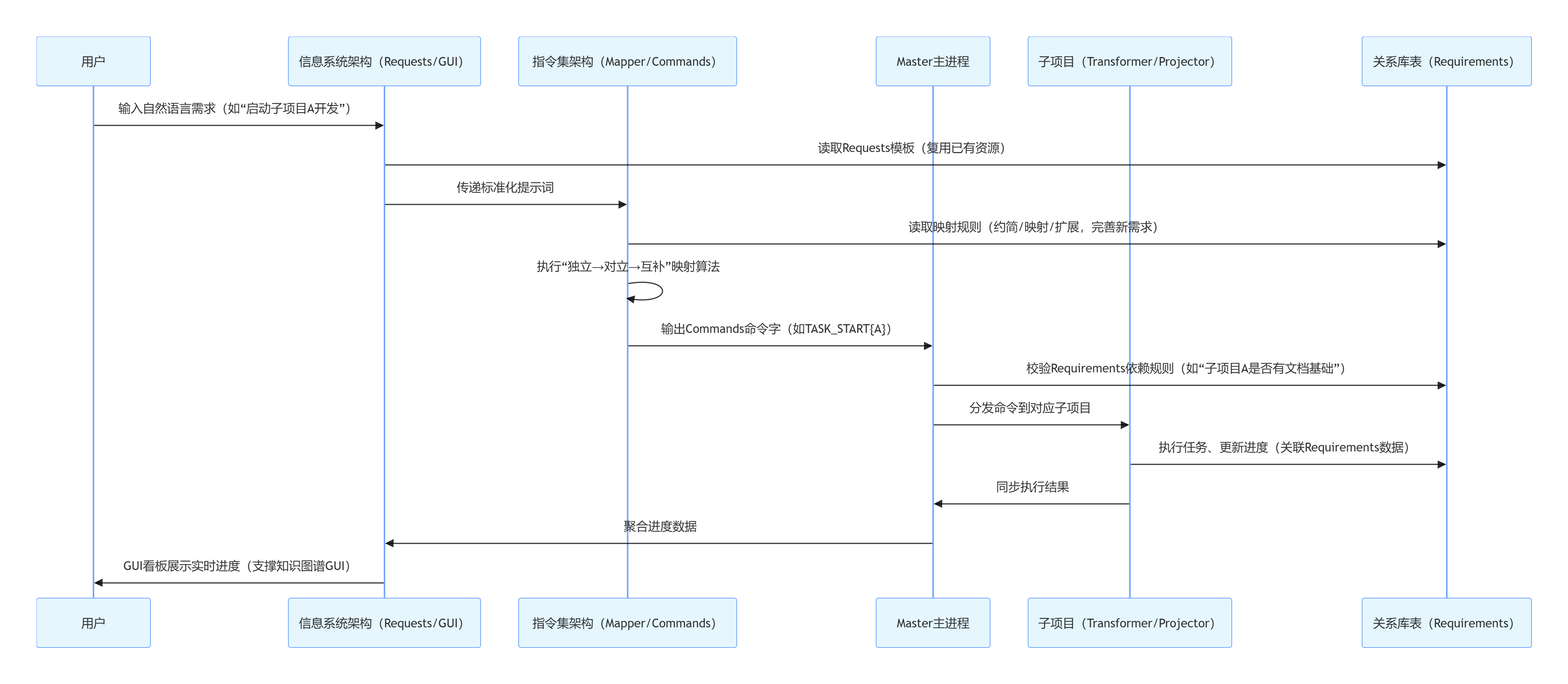 本文系统梳理了多子项目协同中枢的设计框架,围绕"实现已有资源+完善新需求"的核心目标,构建了标准化、模块化的开发体系。主要内容包括:三层架构设计:信息系统架构(抽象层)处理自然语言需求指令集架构(逻辑层)执行命令映射物理层规约确保硬件约束合规模块化实现方案:采用Master调度进程+三类子项目(Transformer/Projector/Mapper)通过关系库表实现数据一致性提供CLI工具和st