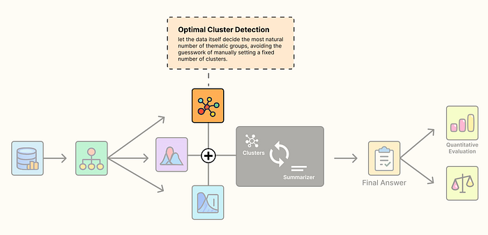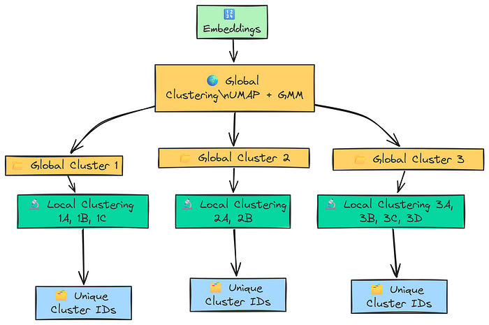 def perform_clustering(embeddings: np.ndarray, dim: int = 10, threshold: float = 0.1) -> List[np.ndarray]: """Perform hierarchical clustering (global and local) on the embeddings.""" # Handle cases with very few documents to avoid errors during dimensionality reduction. if len(embeddings) <= dim + 1: return [np.array([0]) for _ in range(len(embeddings))] # --- Global Clustering Stage --- # First, reduce the dimensionality of all embeddings globally. reduced_embeddings_global = global_cluster_embeddings(embeddings, dim) # Then, perform GMM clustering on the reduced-dimensional data. global_clusters, n_global_clusters = GMM_cluster(reduced_embeddings_global, threshold) # --- Local Clustering Stage --- # Initialize a list to hold all final local cluster assignments for each document. all_local_clusters = [np.array([]) for _ in range(len(embeddings))] # Keep track of the total number of clusters found so far to ensure unique IDs. total_clusters = 0 # Iterate through each global cluster to find sub-clusters. for i in range(n_global_clusters): # Get all original indices for embeddings that are part of the current global cluster. global_cluster_indices = [idx for idx, gc in enumerate(global_clusters) if i in gc] ifnot global_cluster_indices: continue # Get the actual embeddings for this global cluster. global_cluster_embeddings_ = embeddings[global_cluster_indices] # Perform local clustering on this subset of embeddings. if len(global_cluster_embeddings_) <= dim + 1: local_clusters, n_local_clusters = ([np.array([0])] * len(global_cluster_embeddings_)), 1 else: # We don't need a separate 'local_cluster_embeddings' function. # The global one works, as it adapts n_neighbors to the input reduced_embeddings_local = global_cluster_embeddings(global_cluster_embeddings_, dim) local_clusters, n_local_clusters = GMM_cluster(reduced_embeddings_local, threshold) # Map the local cluster IDs back to the original document indices. for original_idx, local_cluster_ids in zip(global_cluster_indices, local_clusters): # We add 'total_clusters' to ensure each cluster ID is globally unique. all_local_clusters[original_idx] = local_cluster_ids + total_clusters total_clusters += n_local_clusters # Return the final, globally unique cluster assignments for each document. return all_local_clusters