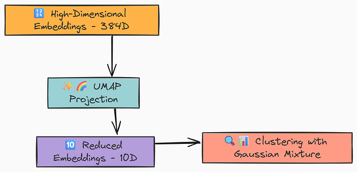 UMAP (Uniform Manifold Approximation and Projection,统一流形近似与投影) 就像一个强大的透视镜,能将这些高维数据投影到更低的维度(比如10维),同时最大限度地保持数据点之间的语义关系。这就像把一张复杂的立体地图变成一张清晰的平面地图,让聚类算法能够更轻松地识别出数据的“形状”和“分组”。