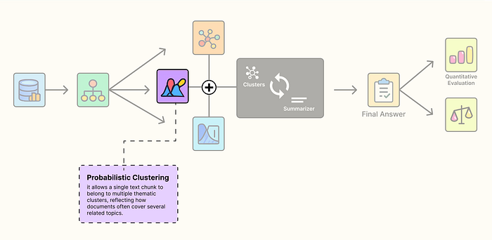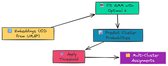 GMM 能够实现“软聚类”。它不直接分配,而是计算每个文档块属于每个簇的概率。通过设置一个概率阈值,我们可以让一个文档块同时被分配到多个相关的簇中。这完美地模拟了知识之间的交叉和关联。