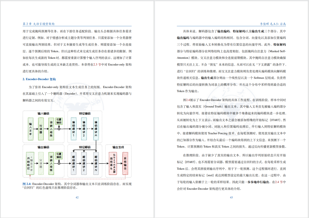 这本书解析了大模型架构的发展阶段,详述Encoder - only(如BERT,专注输入文本特征提取 )、Encoder - Decoder(如T5、BART,适配序列到序列任务 )、Decoder-only(如GPT系列,借 “自回归” 生成文本 )三类主流架构,剖析其网络结构、训练方法创新点,也提及非Transformer架构模型,展现领域研究多元生态。