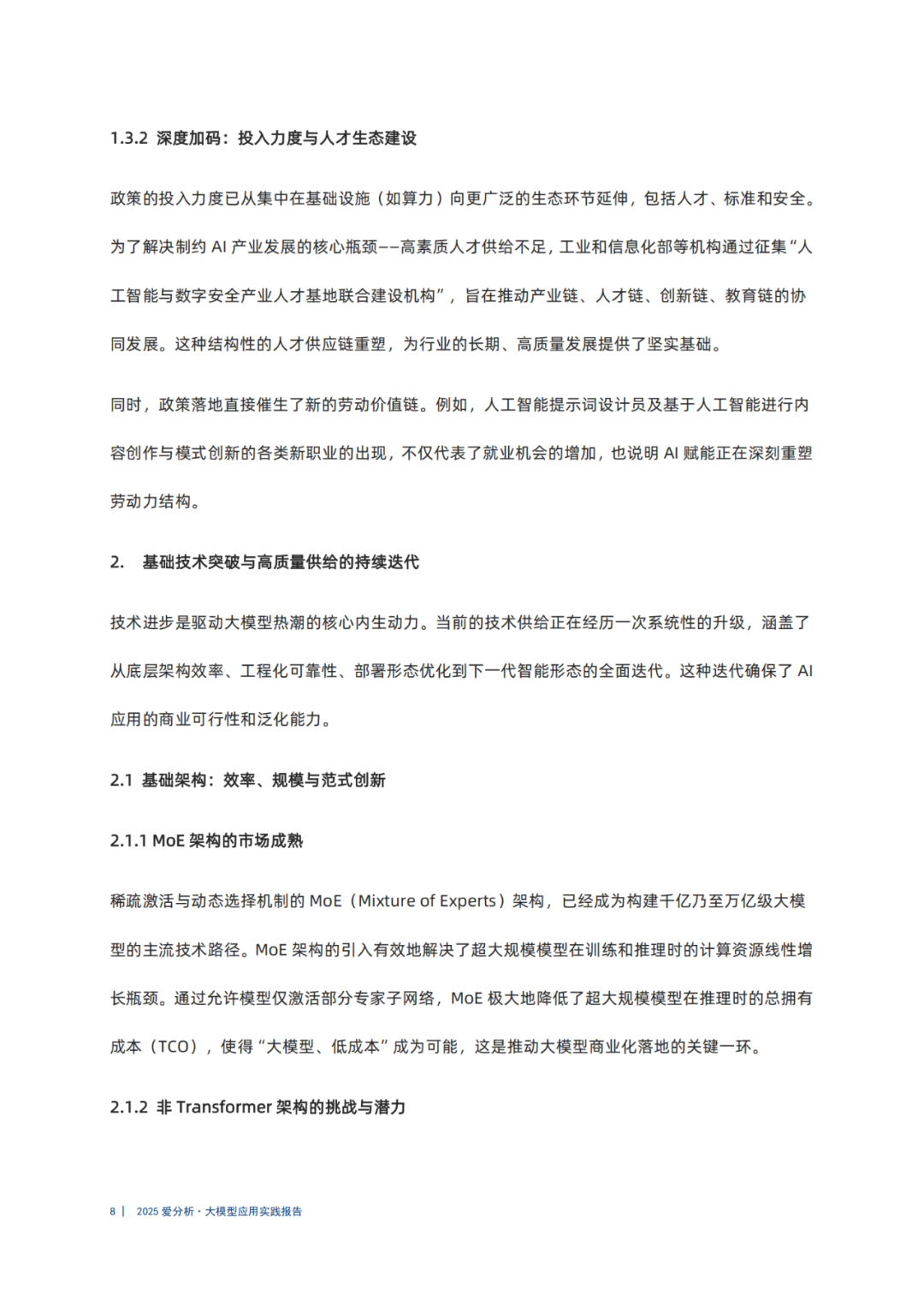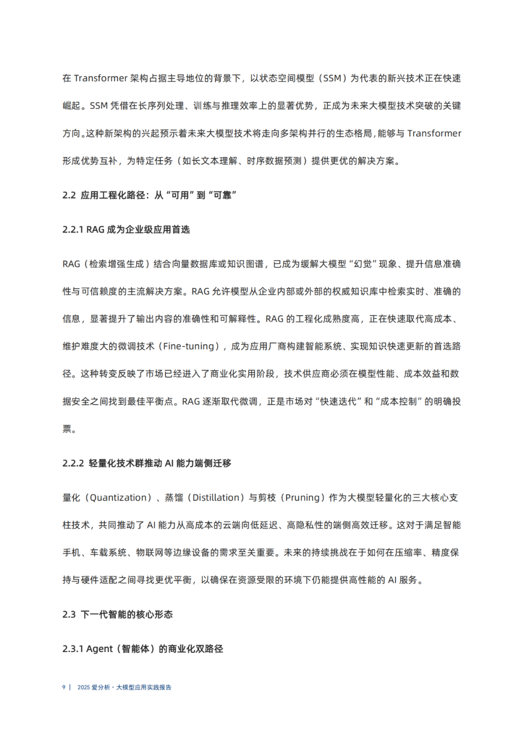 技术:MoE 架构、RAG、轻量化技术等让大模型更可靠可负担,Agent(智能体)成核心落地形态。