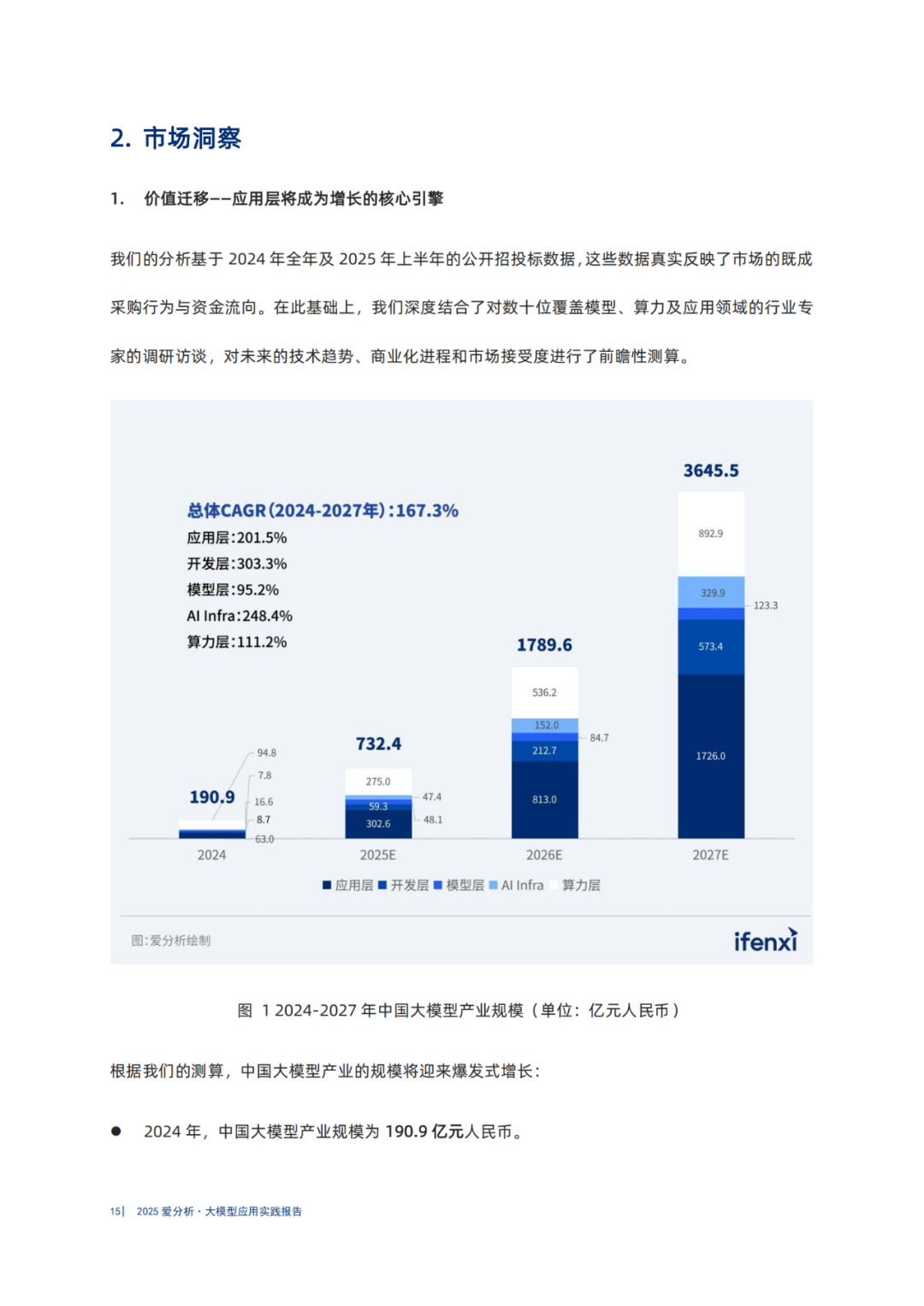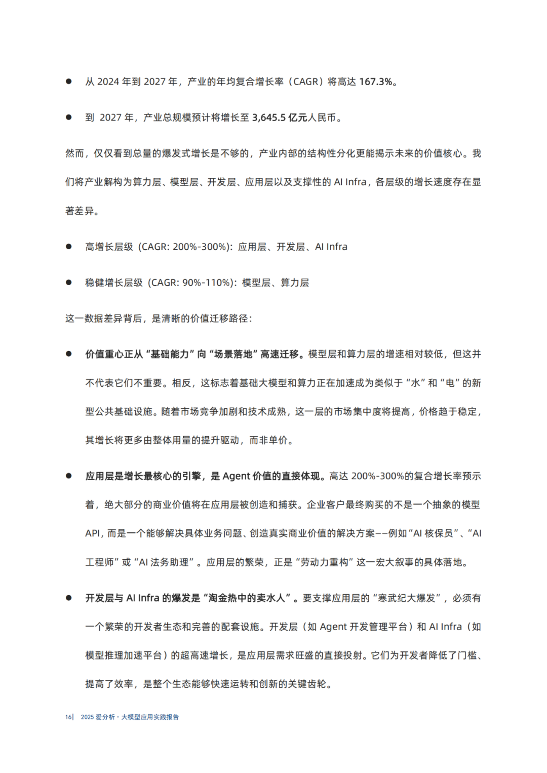 这份报告核心结论是中国大模型市场已从 “基础建设” 转向 “应用落地”,2024-2027 年产业规模 CAGR 达 167.3%,2027 年将达 3645.5 亿元,应用层成增长核心与最大市场。