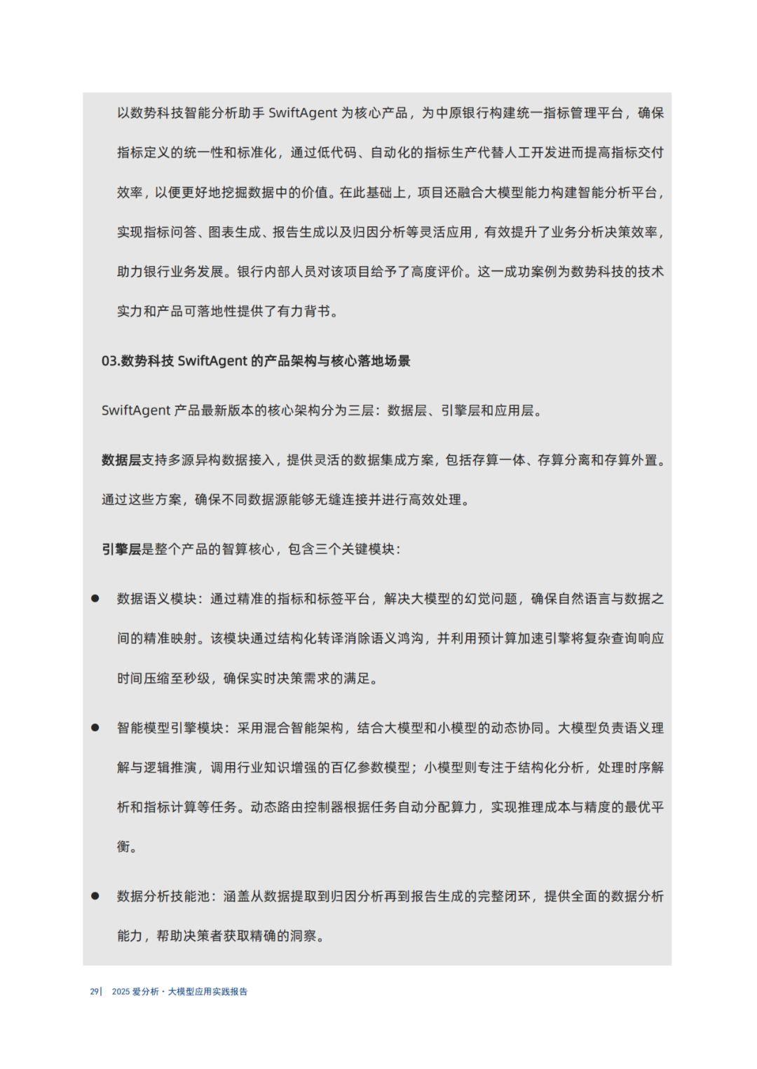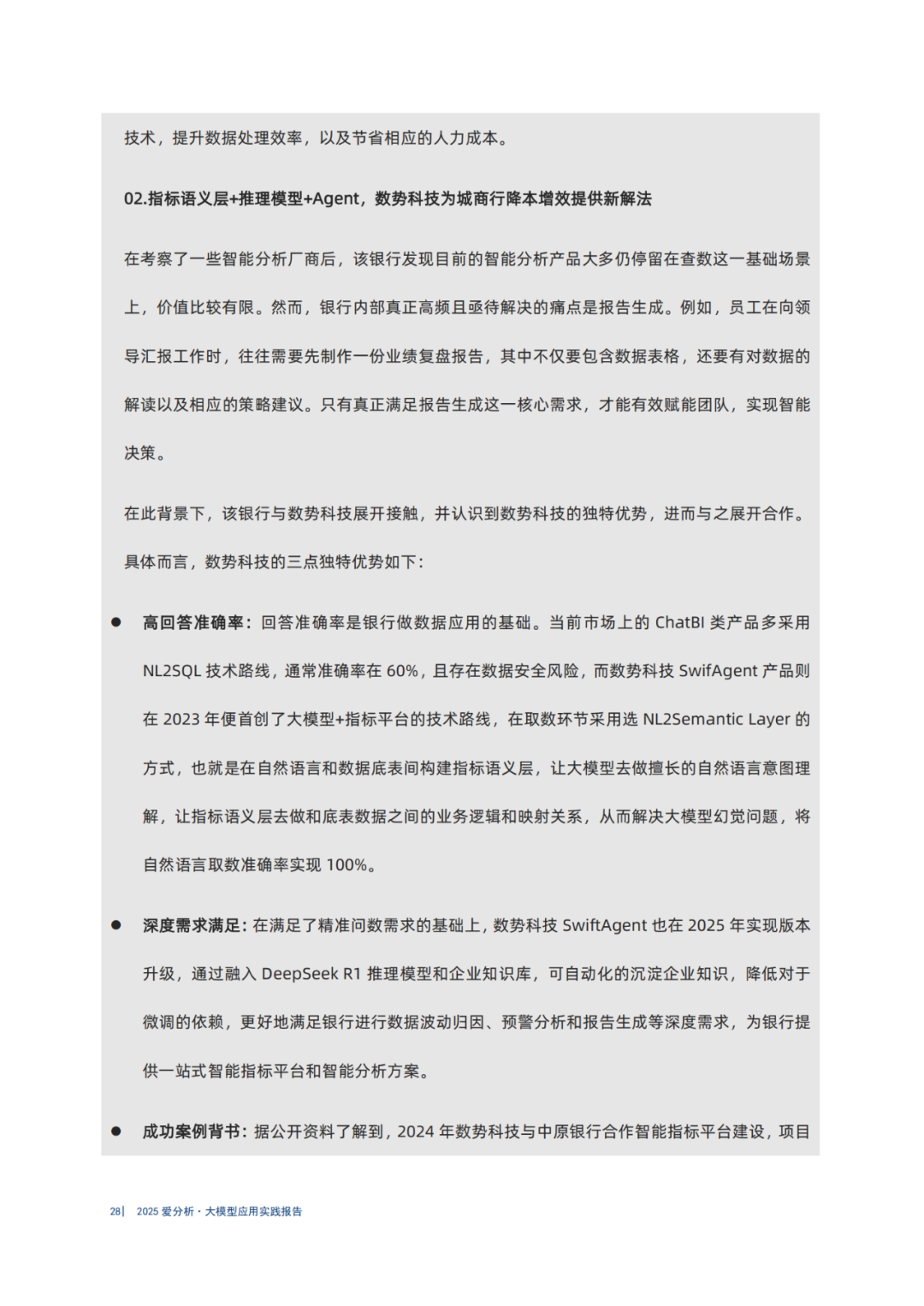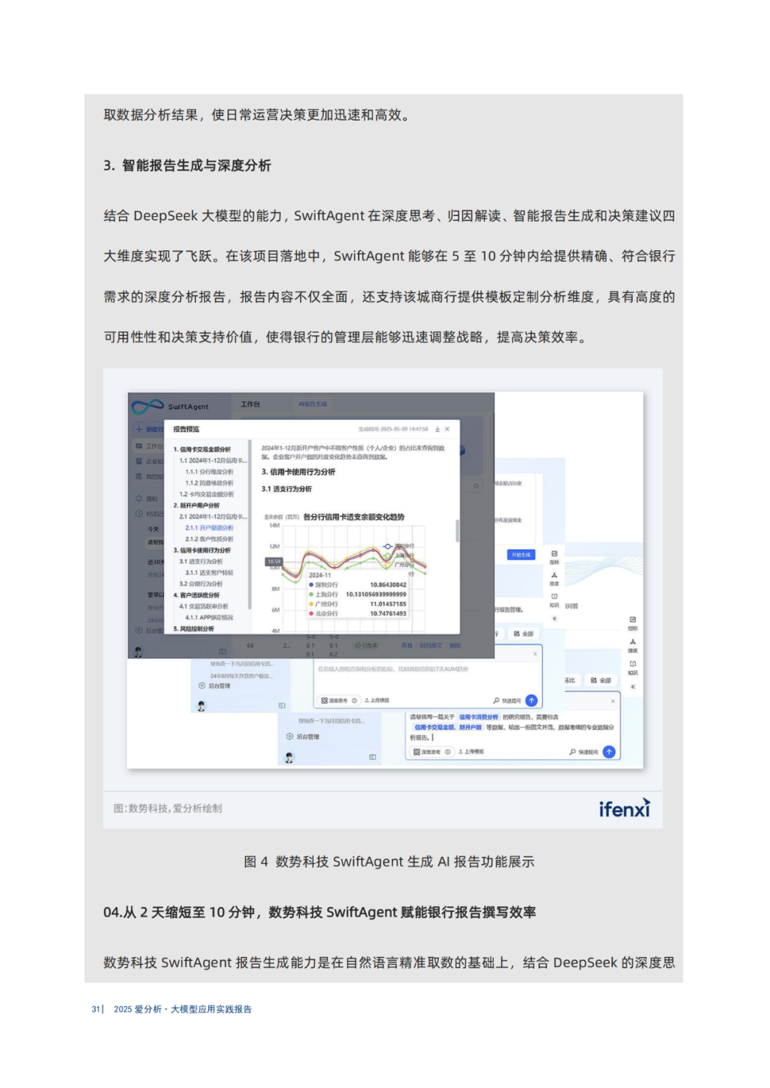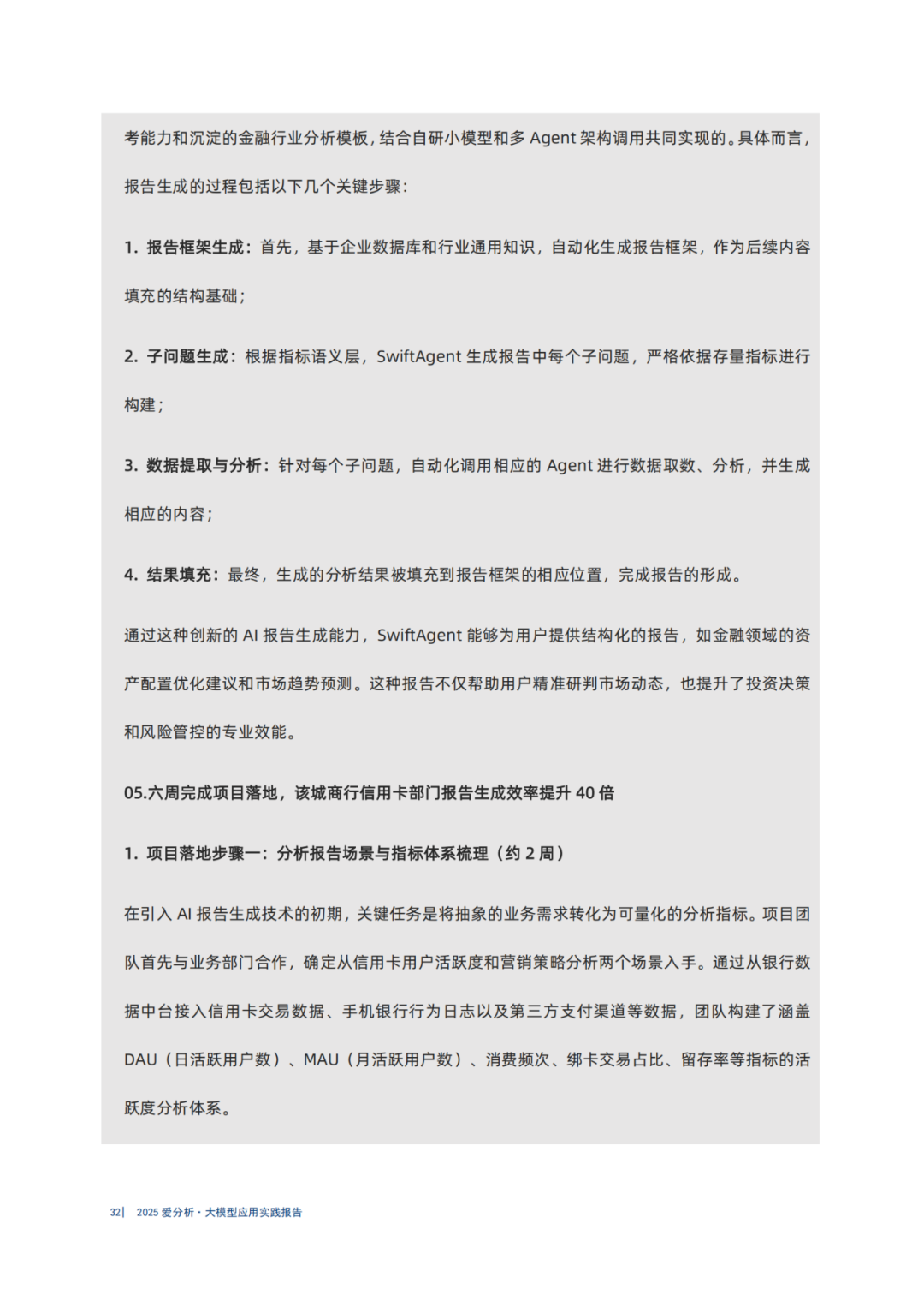 对话式智能分析:以 “报告生成” 为核心,通过混合架构、多 Agent 协作提升效率,某城商行应用后报告生成效率提升 40 倍。