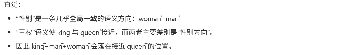 - 语义运算可线性化:很多关系接近“平移向量”,因此能做类比。