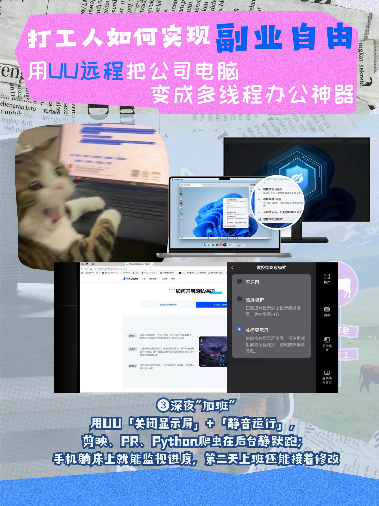 用UU「关闭显示屏」+「静音运行」,剪映、PR、Python爬虫在后台静默跑;手机躺床上就能监视进度,第二天上班还能接着修改