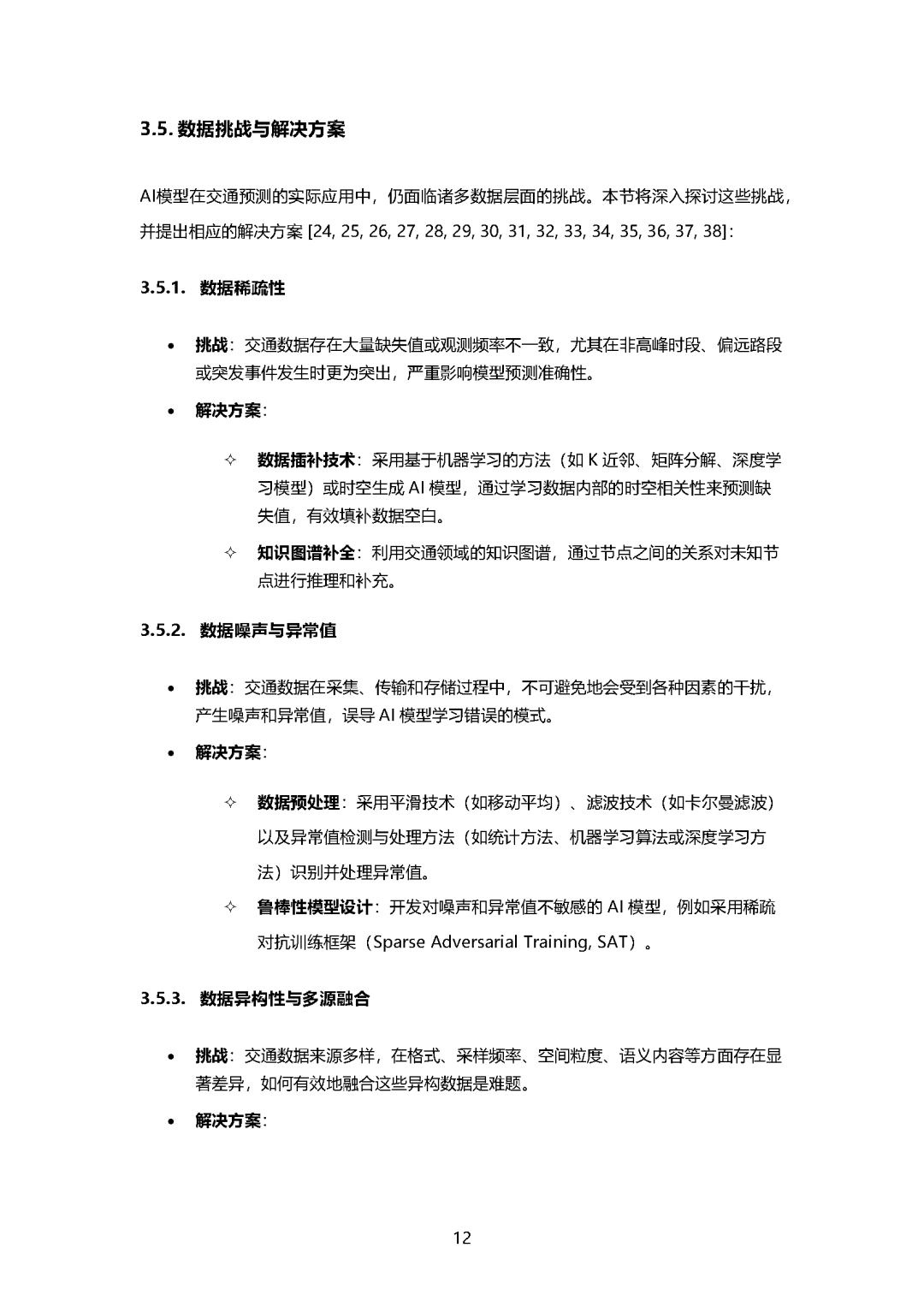 数据稀疏性 非高峰时段、偏远路段数据缺失多 采用机器学习插补技术、时空生成 AI 模型;利用知识图谱补全
