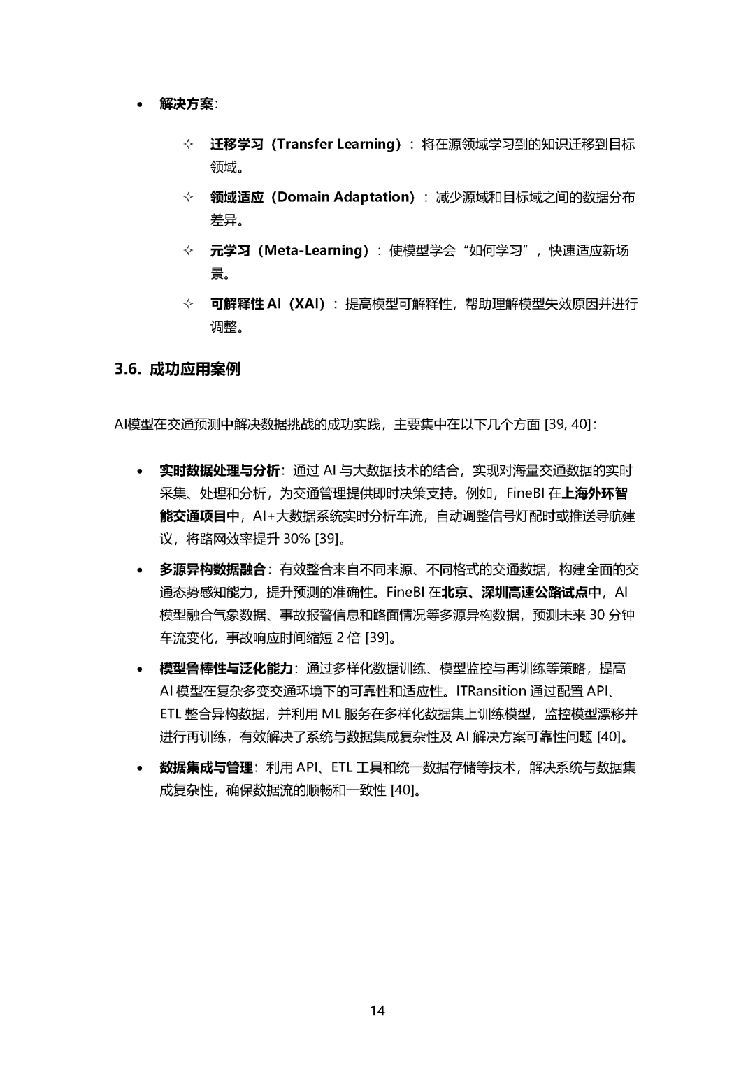 数据泛化能力不足 模型在新区域 / 时段性能下降 迁移学习、领域适应、元学习;提升模型可解释性