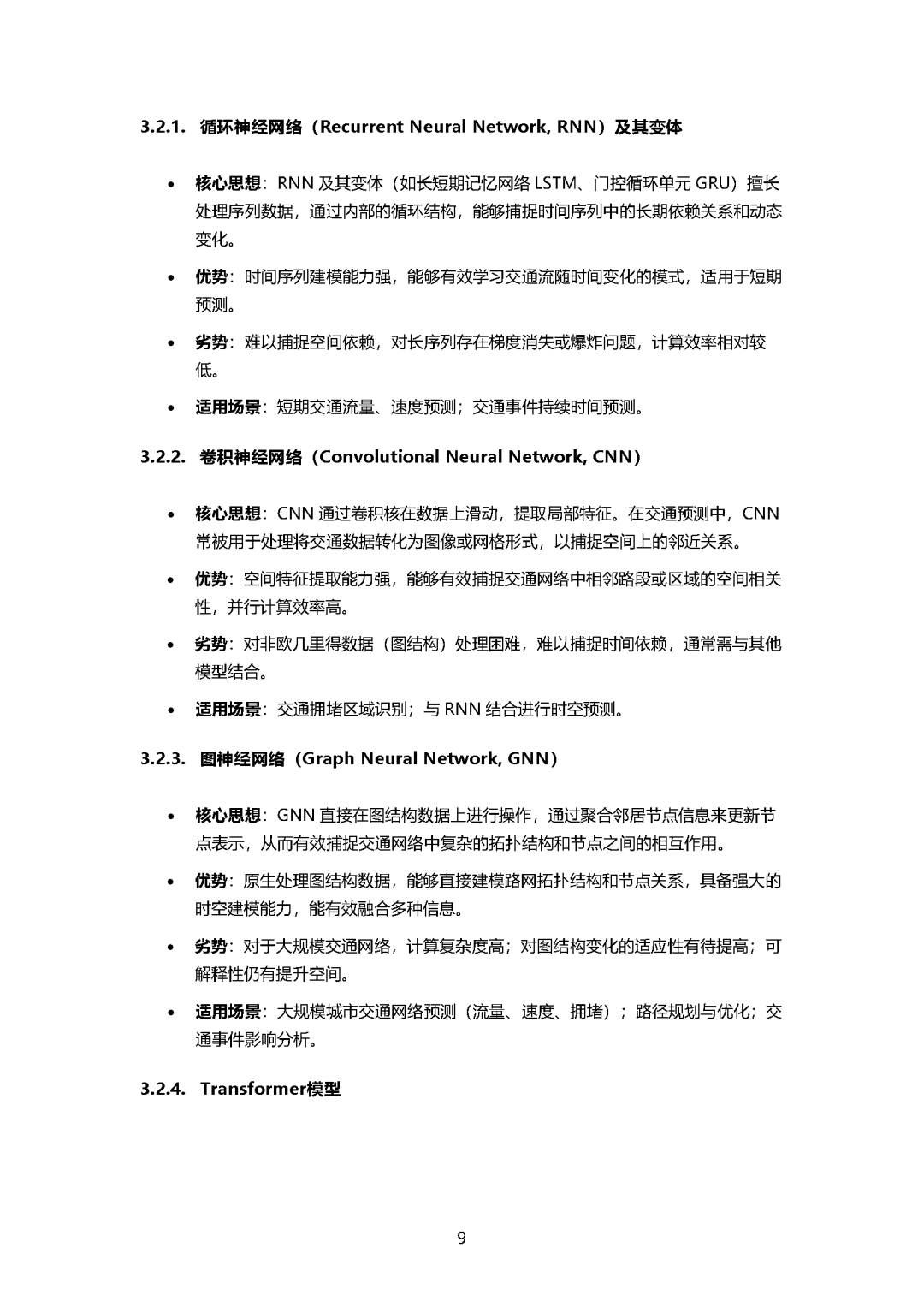 CNN:强于提取空间局部特征,适用于拥堵区域识别,需与其他模型结合处理时间依赖,难处理非欧几里得数据。