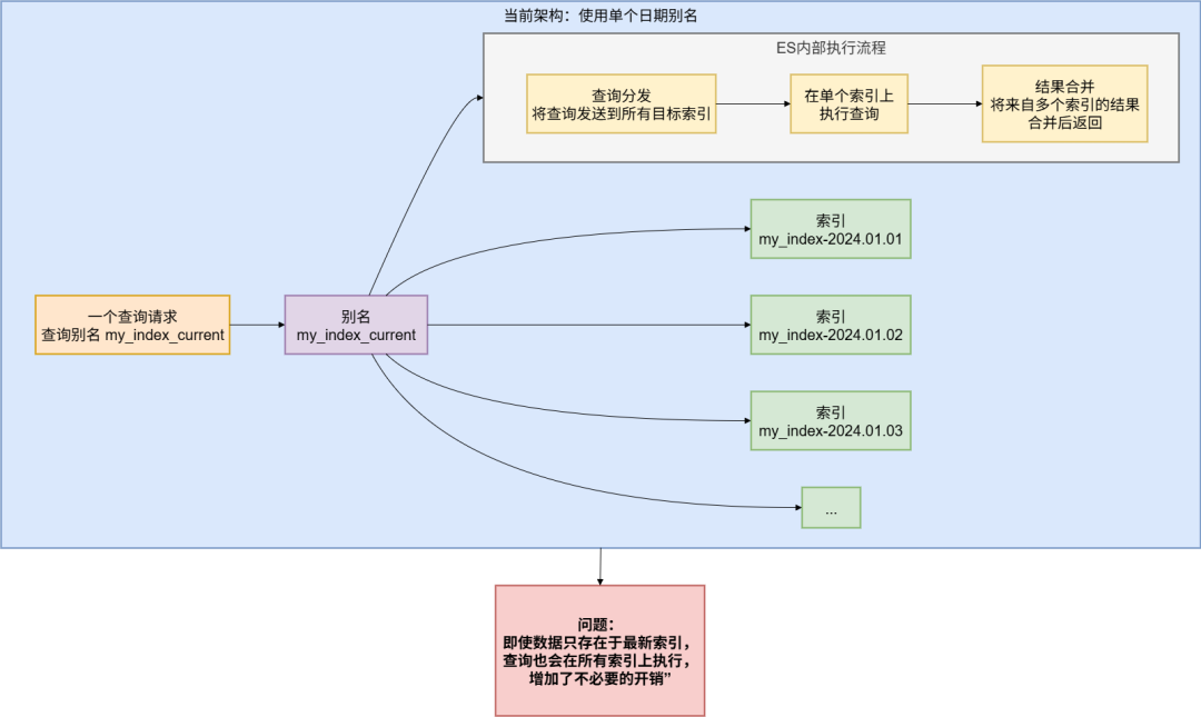 项目中使用了日期别名来管理按天分割的索引,一个别名对应了多个底层索引,ES需要在多个索引间进行查询合并,增加了不必要的开销。
