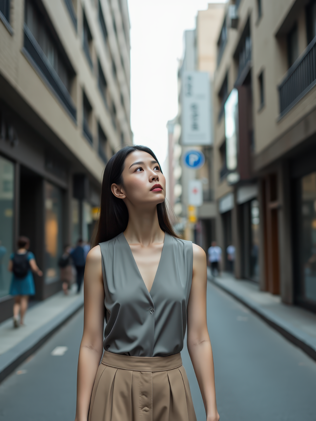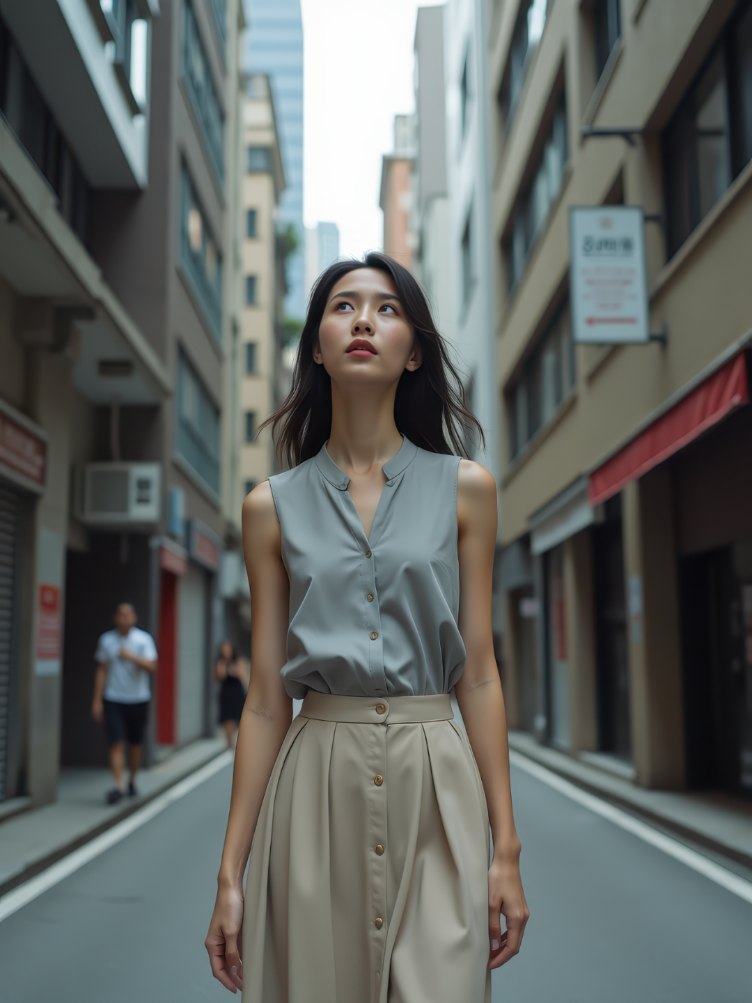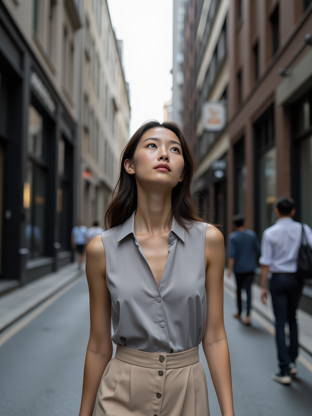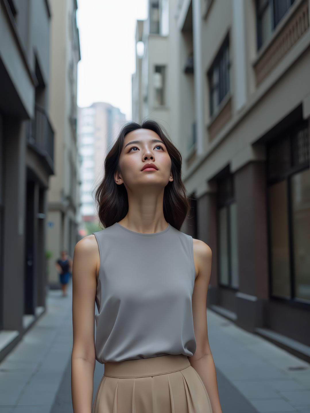 On a narrow pedestrian-only inner alley flanked by tall city buildings, a slim East Asian young woman with fair skin walks slowly, gently lifting her head to gaze upward. She wears a light gray sleeveless blouse and a beige high-waisted midi skirt. Her expression is calm, lips closed, eyes softly focused on the sky. The narrow road is shadowed by the buildings, with a few motion-blurred pedestrians passing by in the background. Vertical composition, three-quarter body, 8K ultra-realistic.