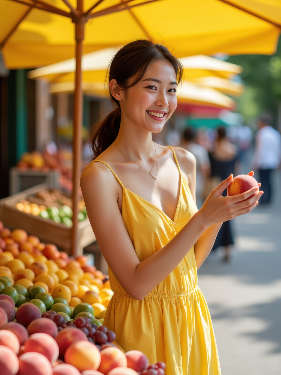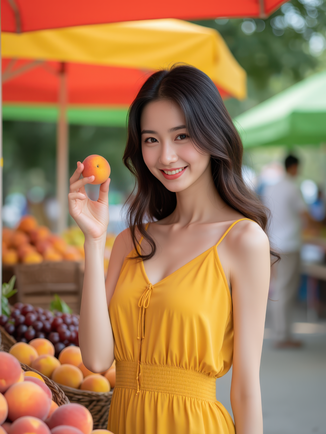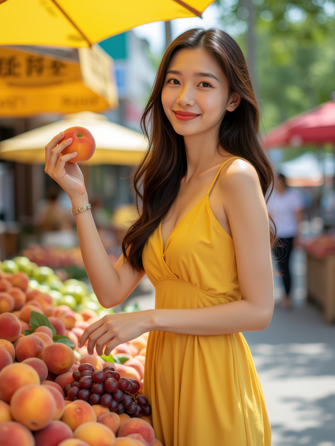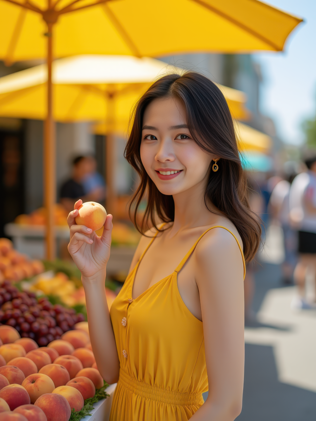在一个彩色遮阳伞下的街头水果摊前,一位穿着黄色夏日裙装的东亚年轻女子正在挑选桃子和葡萄。她单手拿起一个水果,略带微笑地望向镜头。竖构图,七分身,色彩对比丰富,8K 超写实。