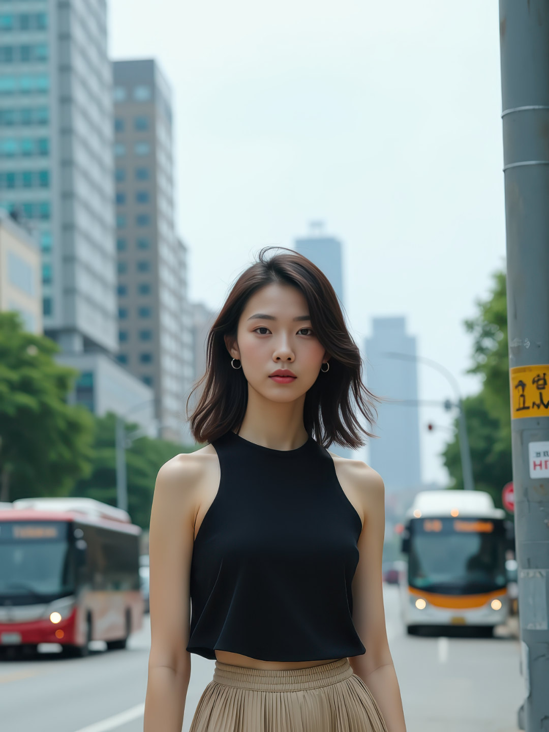 在商业区一处繁忙的街口,一位五官精致、身材苗条的东亚年轻女子静静地站在街灯柱下,穿着黑色无袖上衣与米色百褶裙。她身后是八车道的街道,公交车与快递车在画面中动感模糊穿梭。她面无表情,发丝在微风中微微飘扬。竖构图,半身照,8K 超写实画质。