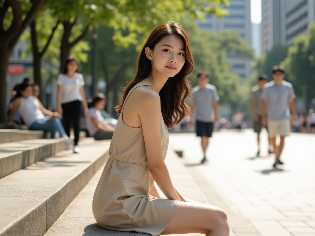 在阳光洒落的城市广场石阶上,一位身材苗条、脸庞精致的东亚年轻女子身穿米色短裙,侧身坐在台阶上,一手撑地,一手搭在腿上。双腿自然弯曲,抬头望向镜头,神情温和。背景中有行人经过或在周围小憩,呈现轻微的动感模糊。横构图,七分身画面。8K 超写实画质。