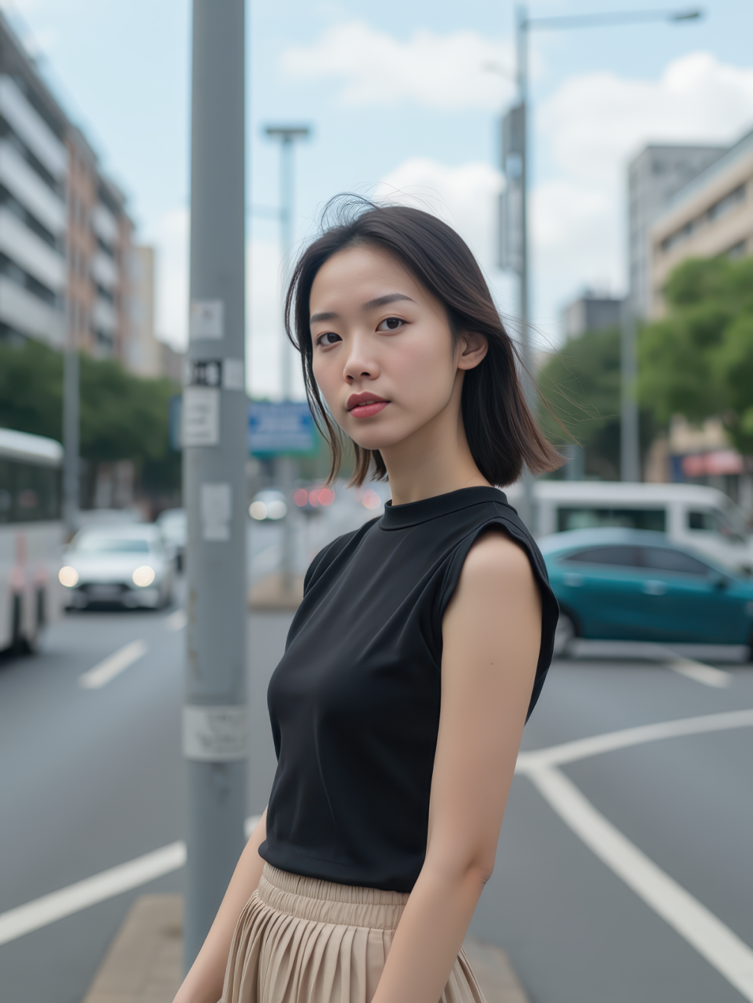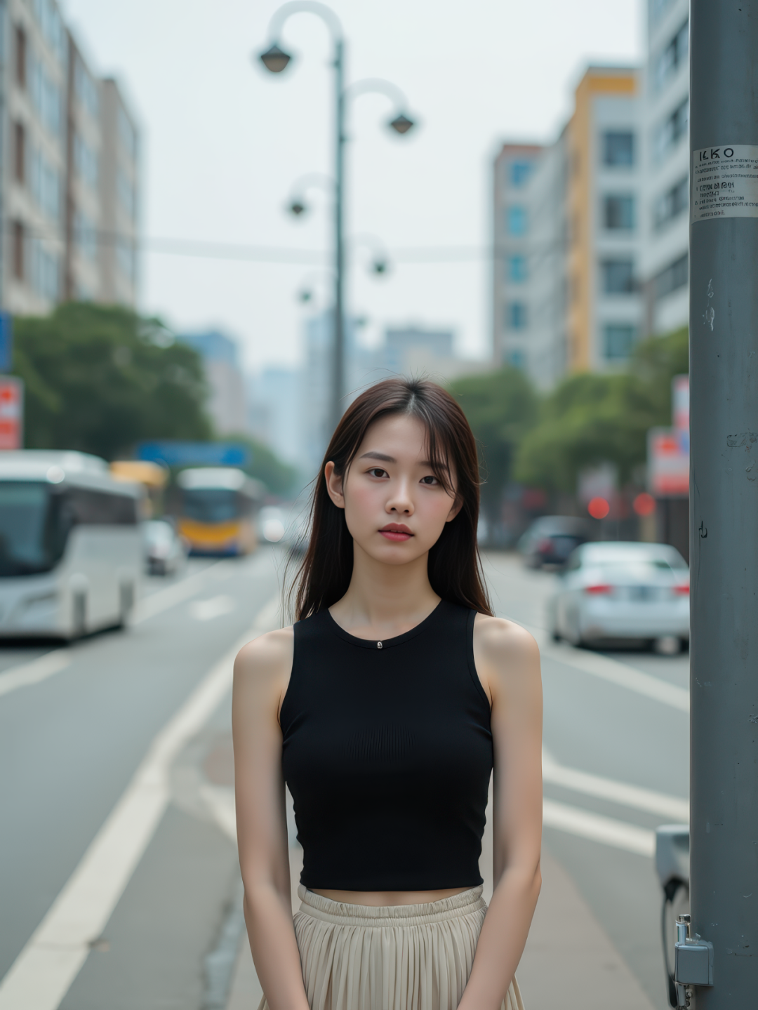At a bustling intersection of a large commercial district, a East Asian young woman with delicate features stands quietly under a streetlamp pole, dressed in a black sleeveless top and beige pleated skirt. The road behind her shows eight lanes with blurred buses and delivery vehicles. Her expression is neutral, hair slightly tousled by the breeze. Vertical composition, waist-up framing. 8K ultra-realistic.