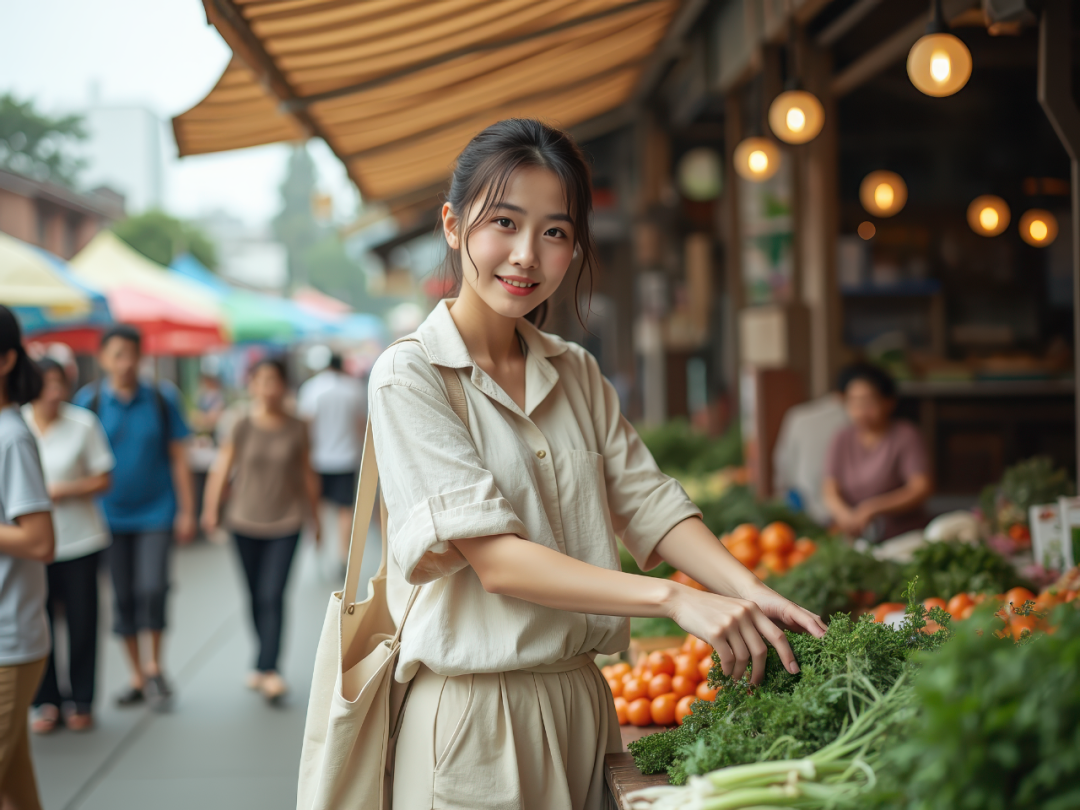 在热闹的露天菜市场中,一位皮肤白皙的东亚年轻女子,穿着浅色亚麻上衣和米色长裤,站在一个蔬菜摊前。她一手正伸向一把青葱,眼神却平静温柔地看向镜头。她的头发随意扎起,在微风中微微飘动,肩侧背着帆布袋。背景中,几位老年摊贩坐在小凳子上,其他顾客匆匆走过,形成动感模糊。头顶彩色条纹布棚在风中轻轻摇晃。横构图,七分身,8K 超写实画质。