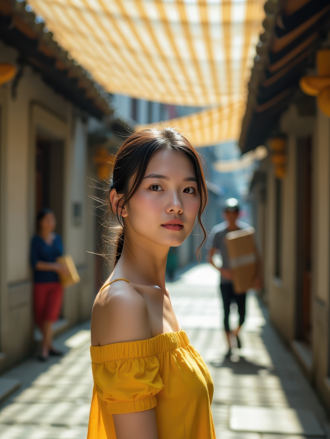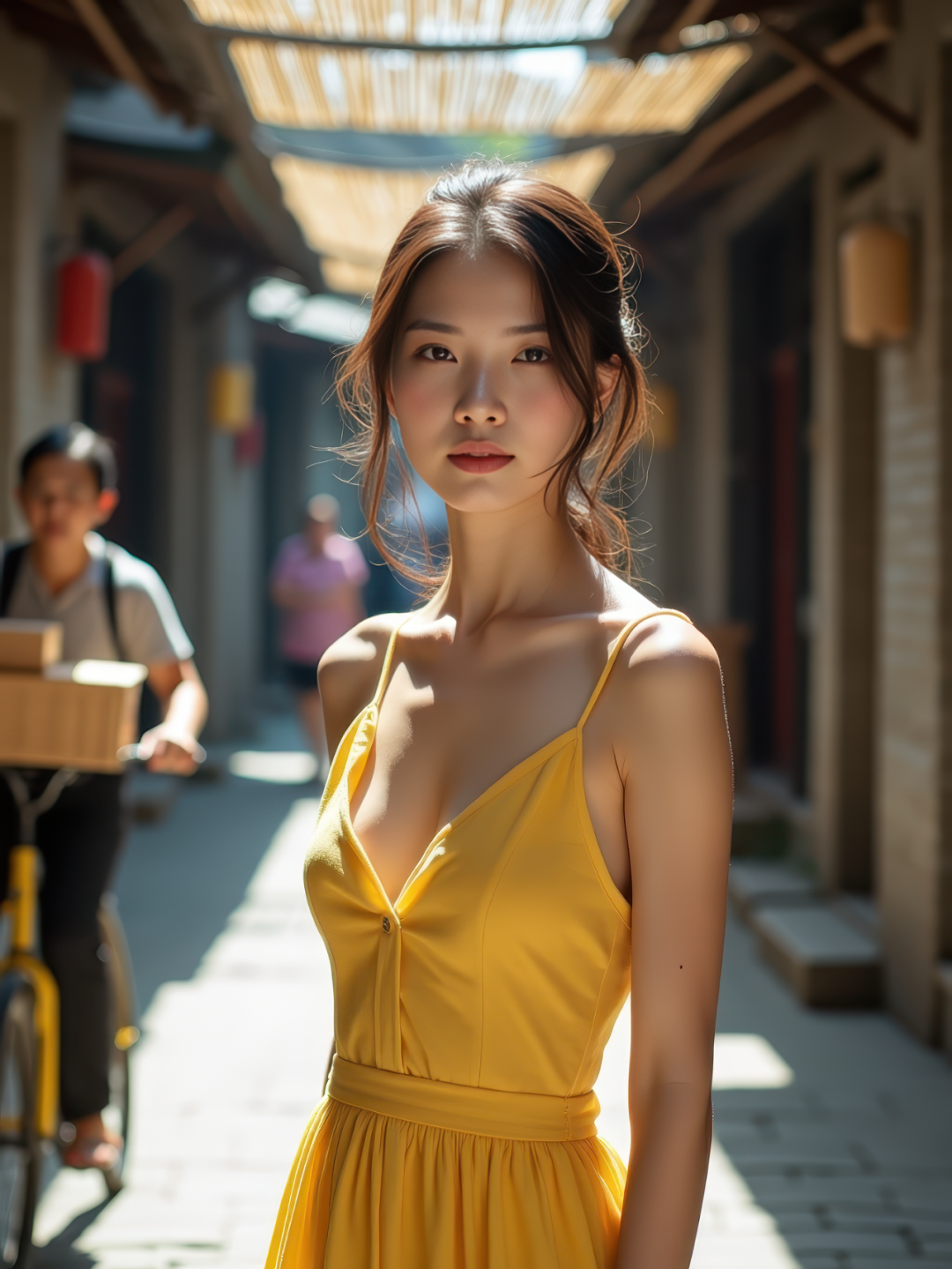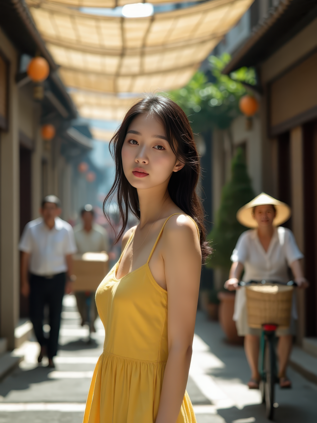 Behind her, the lively street scene becomes an organic part of the composition—a delivery man carrying boxes, a grandmother with a woven shopping bag, and a cyclist blurred by motion. Their natural movements add depth without overpowering the frame, as shallow depth of field (f/1.4) keeps the focus on her direct gaze. Sunlight filters through overhead bamboo shades, painting striped shadows across the cobblestones and her bare shoulders.
