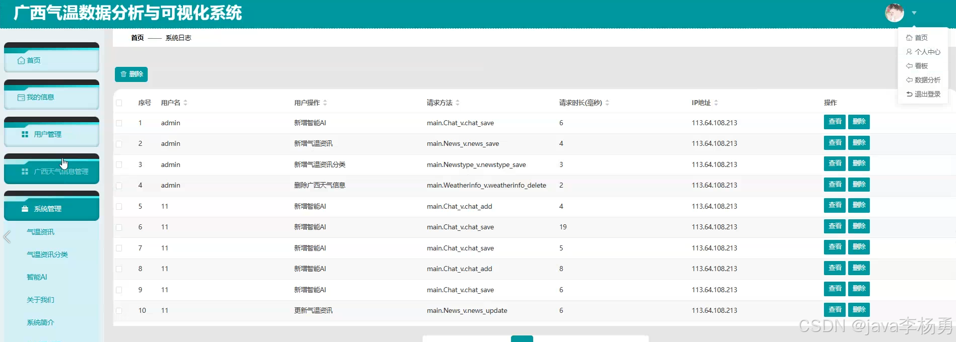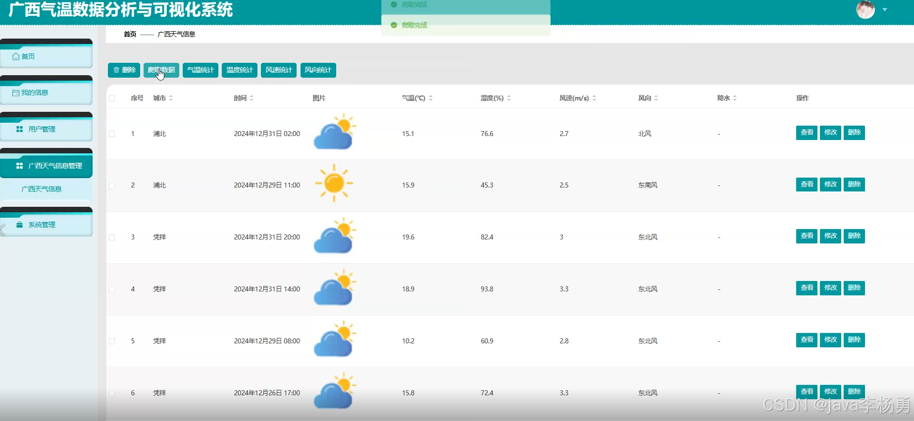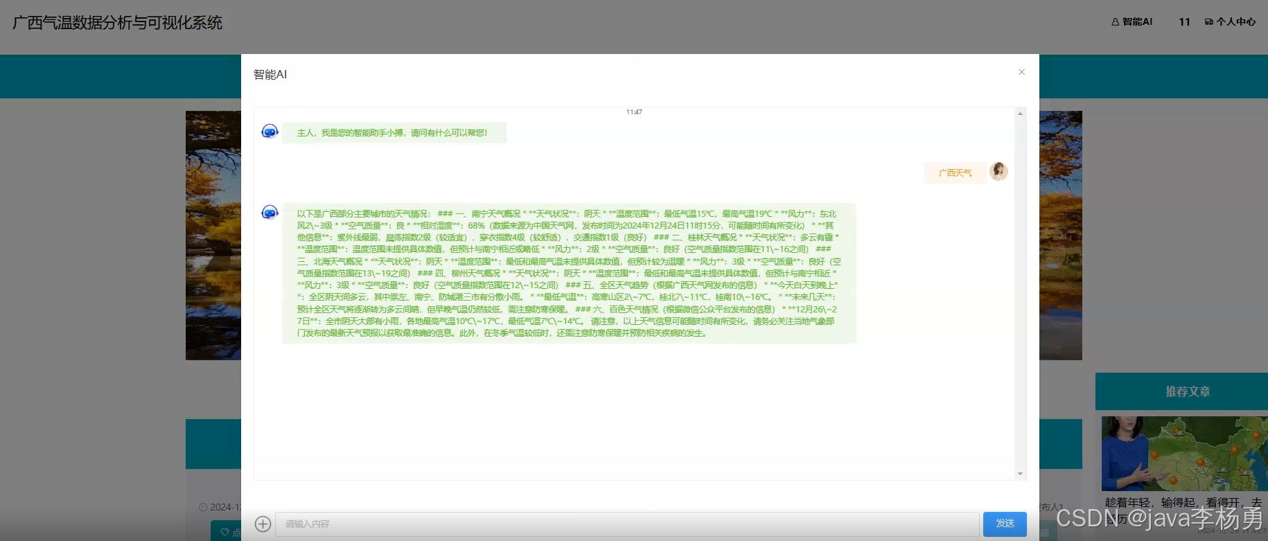 系统能够实时采集广西地区的气温数据,进行高效处理与分析,并通过多种信息图表形式直观地展示气温数据的变化趋势和分布特征,系统还具备智能AI分析功能,能够根据历史数据预测未来气温变化,为用户提供更加精准的气象信息服务。结论上该系统成功实现了广西气温数据分析与可视化,不仅提升了气象信息管理的水平,也为推动广西地区经济社会发展、保障人民生命财产安全作出了重要贡献。