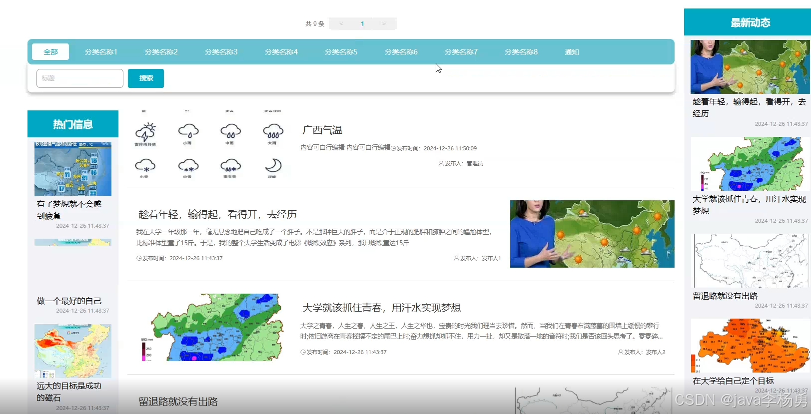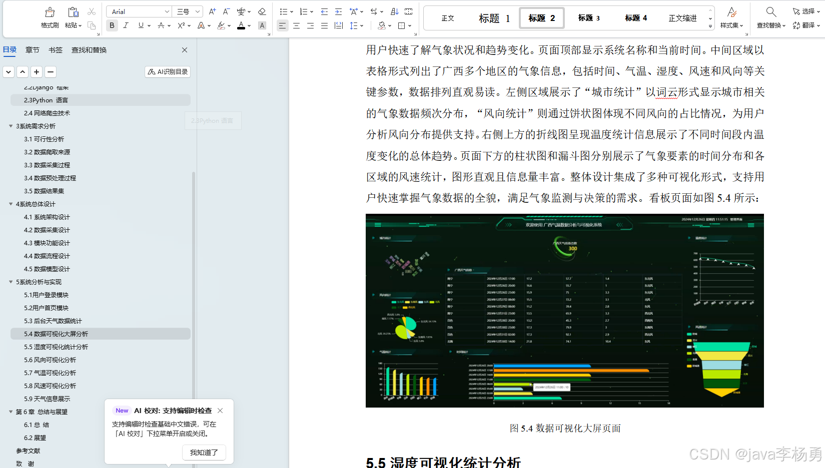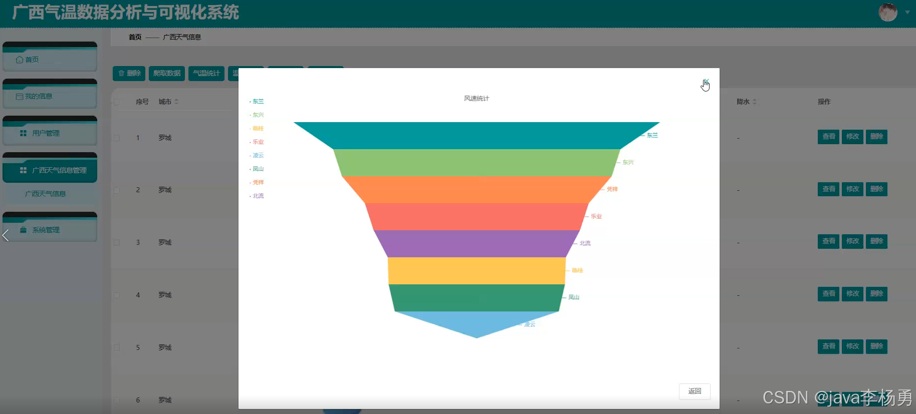系统能够实时采集广西地区的气温数据,进行高效处理与分析,并通过多种信息图表形式直观地展示气温数据的变化趋势和分布特征,系统还具备智能AI分析功能,能够根据历史数据预测未来气温变化,为用户提供更加精准的气象信息服务。结论上该系统成功实现了广西气温数据分析与可视化,不仅提升了气象信息管理的水平,也为推动广西地区经济社会发展、保障人民生命财产安全作出了重要贡献。