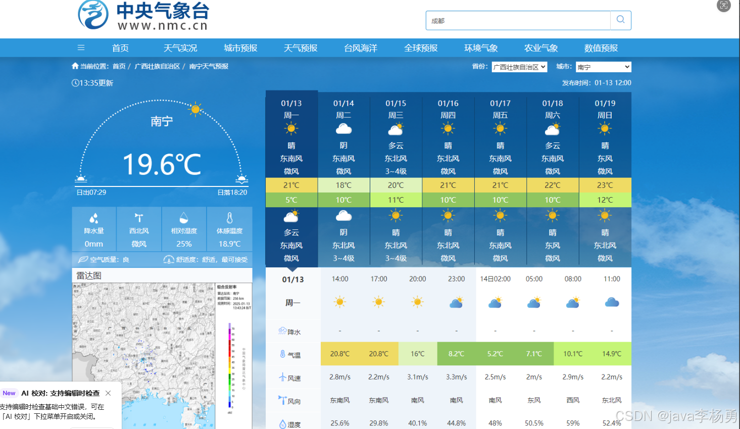 在广西气温数据分析与可视化系统开发中,数据爬取是获取有效信息的关键步骤之一。本文的数据爬取主要来源于中央气象台如(http://www.nmc.cn/publish/forecast/AGX/nanning.html)。中央气象台是中国国家气象中心的官方平台,提供权威的天气预报、气象实况、城市天气、台风信息、环境气象等多方面的气象服务。用户可以通过中央气象台平台获取实时更新的天气数据,如降水量、气温、风向、相对湿度等,以及未来几天的逐小时、逐日天气趋势预测。平台还提供雷达图、空气质量指数等专业气象数据,为公众出行、农业生产、环境监测等领域提供重要的参考依据。通过中央气象台获取精准可靠的气象信息,为数据分析与决策支持提供强有力的基础。