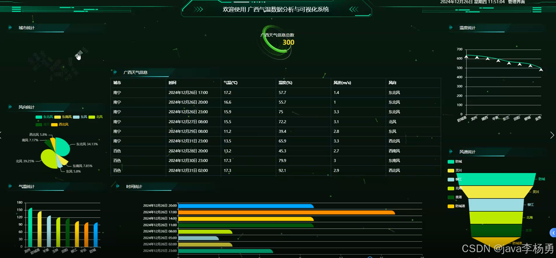 该页面是广西气温数据分析与可视化系统的管理界面,展示气象数据的统计分析结果信息。页面整体采用深色背景设计,布局清晰,包含多个数据可视化模块,帮助用户快速了解气象状况和趋势变化。页面顶部显示系统名称和当前时间。中间区域以表格形式列出了广西多个地区的气象信息,包括时间、气温、湿度、风速和风向等关键参数,数据排列直观易读。左侧区域展示了“城市统计”以词云形式显示城市相关的气象数据频次分布,“风向统计”则通过饼状图体现不同风向的占比情况,为用户分析风向分布提供支持。右侧上方的折线图呈现温度统计信息展示了不同时间段内温度变化的总体趋势。页面下方的柱状图和漏斗图分别展示了气象要素的时间分布和各区域的风速统计,图形直观且信息量丰富。整体设计集成了多种可视化形式,支持用户快速掌握气象数据的全貌,满足气象监测与决策的需求
