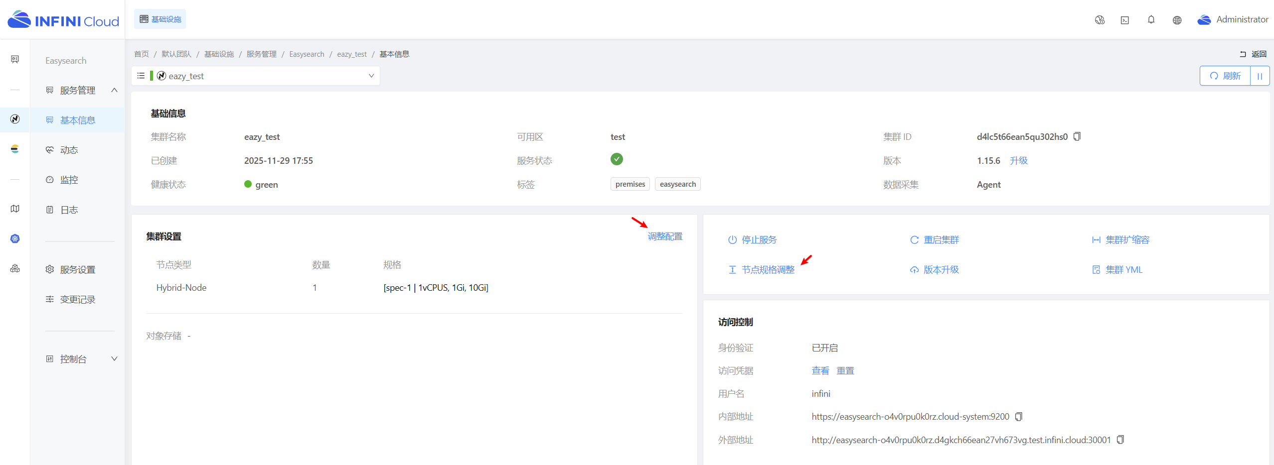 上一篇我们在 INFINI Cloud 中发布了一个 1C1G 的单节点 Easysearch 集群,这次我们来做下节点资源调整,给节点升级到 2C2G。