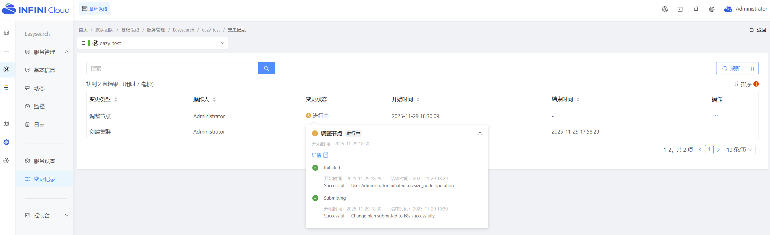 本文介绍了在INFINICloud中对Easysearch集群进行节点资源升级的操作步骤。通过集群详情页面的"调整规格"功能,将单节点配置从1C1G升级到2C2G,并将磁盘空间扩容至15GB。操作完成后,可在变更记录中查看进度,最终在集群详情页确认新的资源规格。整个过程简单明了,实现了集群资源的无缝升级。