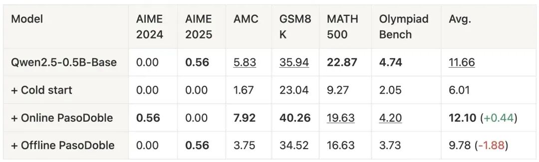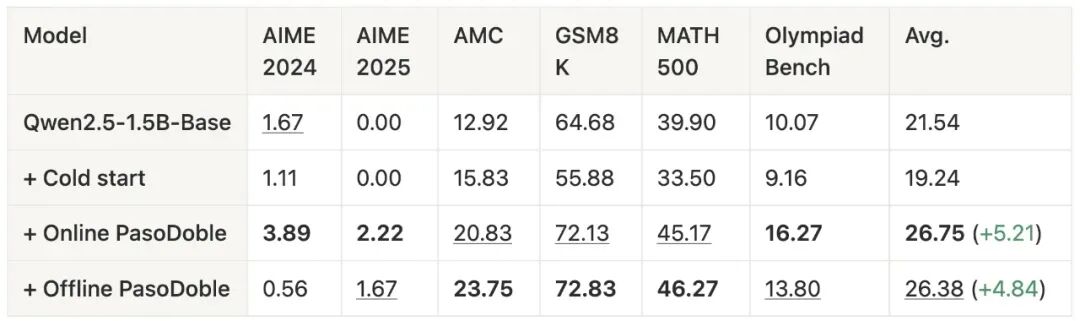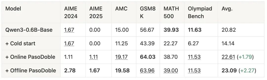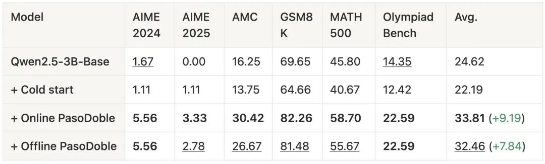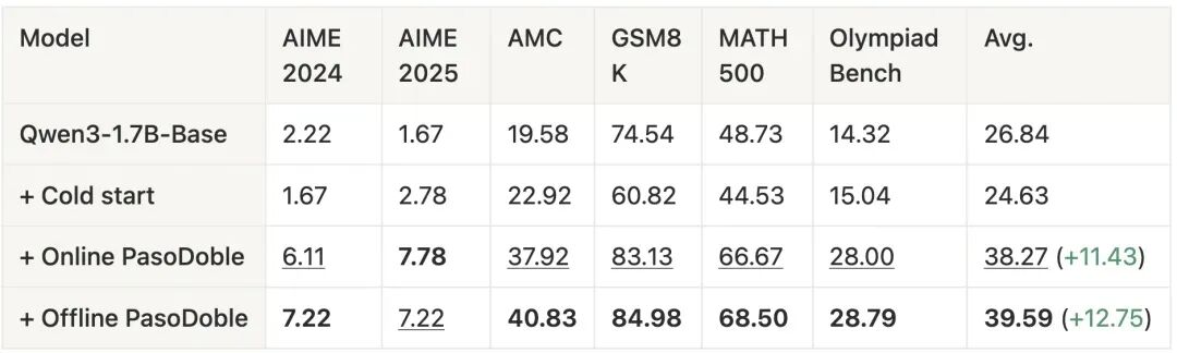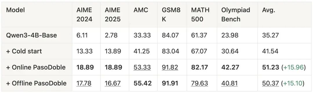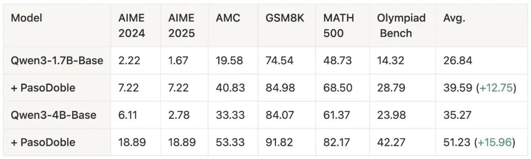 我们发现,在完全无监督的情况下,PasoDoble 使 Qwen3-1.7B-Base 的数学任务平均性能提升约 13 个点,使 Qwen3-4B-Base 提升约 16 个点。