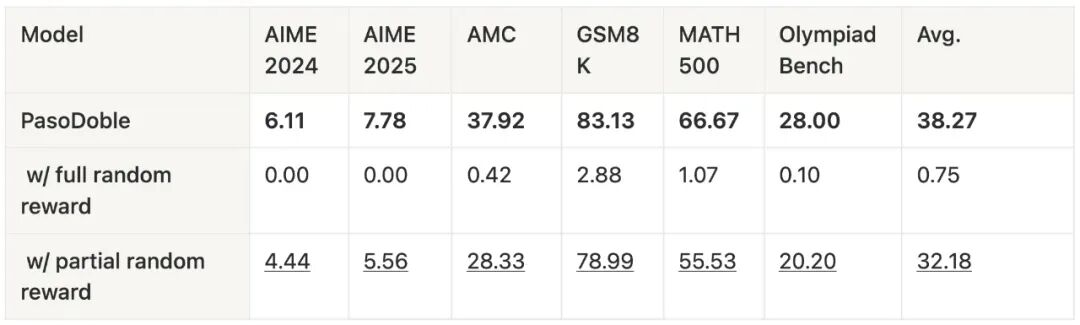 完全随机奖励:Solver 接收到服从的均匀随机奖励,这会在 Proposer 的难度奖励中引入相应的随机性。 部分随机奖励:当 Solver 的输出格式错误(例如没有答案框)时奖励为 0,否则给予随机奖励。