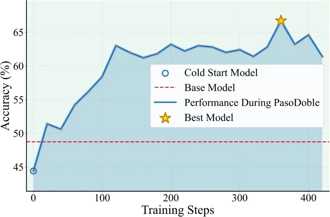 图为使用 Qwen3-1.7B 在 MATH-500 上评估的 Solver 在不同训练步骤中的训练动态。Solver 的整体准确率在无任何监督的情况下从 45% 提升至 67%。它在第 20 步之前就超过了基线模型,并在第 360 步达到最高的 67%。重要的是,PasoDoble 能够在数百个更新步骤中保持持续提升,展现出远强于相关工作 R-Zero 的扩展能力。
