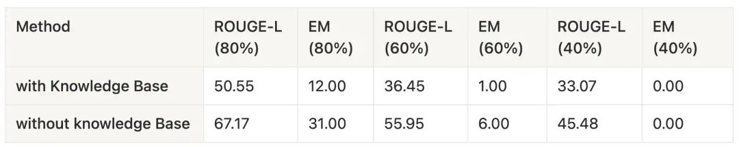 我们通过上表进行了分析。即使提示问题前缀重叠达到 80%,EM 也仅约为 12%(使用知识库)和 31%(不使用知识库),这表明绝大多数生成的问题来源于推理而非记忆。