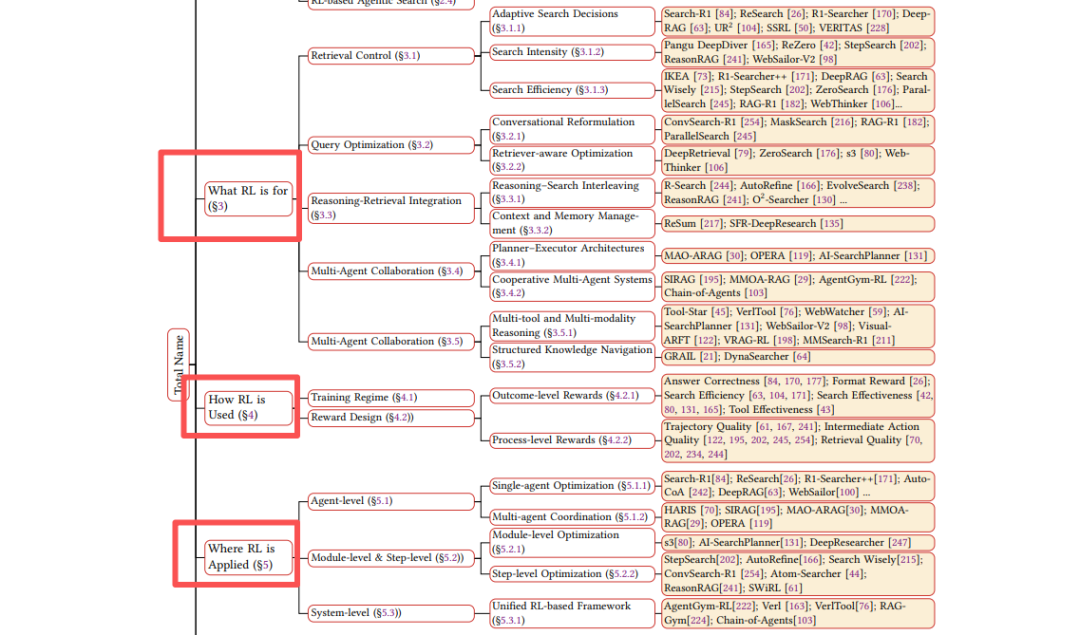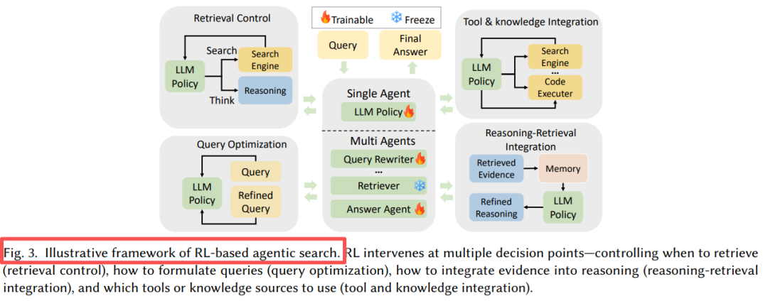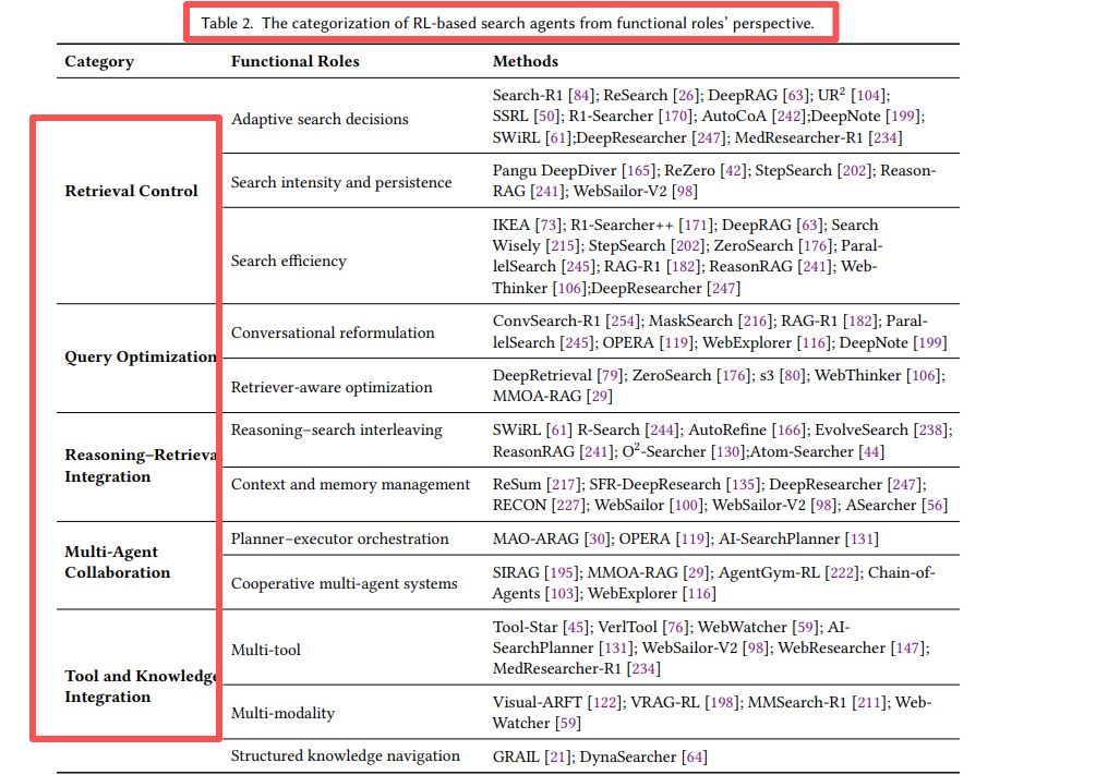 这部分是整篇综述最精彩的内容。作者将RL的功能角色归纳为五大核心类别,并提供了详细的分类表:检索控制、查询优化、推理-检索融合、多智能体协作、工具知识整合