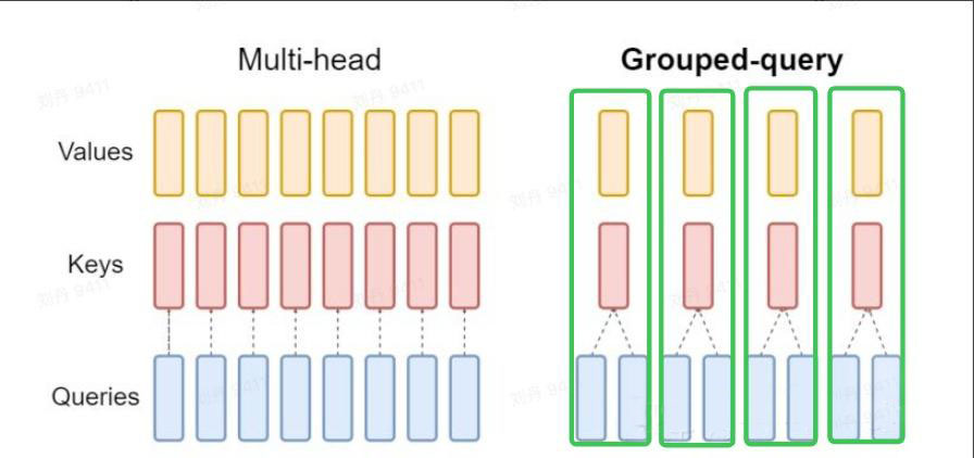 此外需要注意,Qwen3-Coder-FP8在Attention模块中采用了Grouped-query Attention(GQA),以优化KV Cache的显存占用。GQA与原始的多头注意力(MHA)的核心区别在于:GQA将查询头(q heads)分组并共享同一组键值头(kv heads),大大减少kv heads的数量。