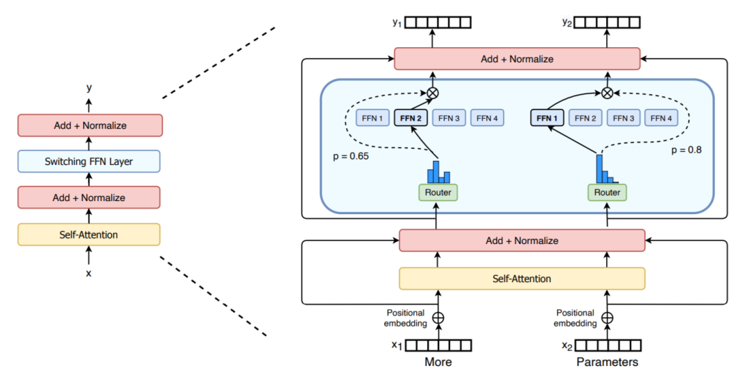 图2 moe FFN layer由多个小矩阵(experts)组成