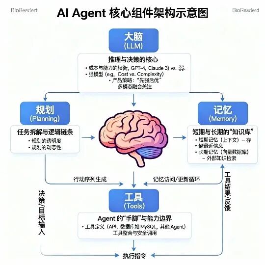 这个场景里,Agent会这样思考:第一步需要调用天气API获取数据;第二步根据结果判断分支——雨天调用邮件工具,晴天调用订票工具。这里面涉及两个关键能力:规划(Planning)和工具使用(Tool Use),也是Agent落地的核心难点。
