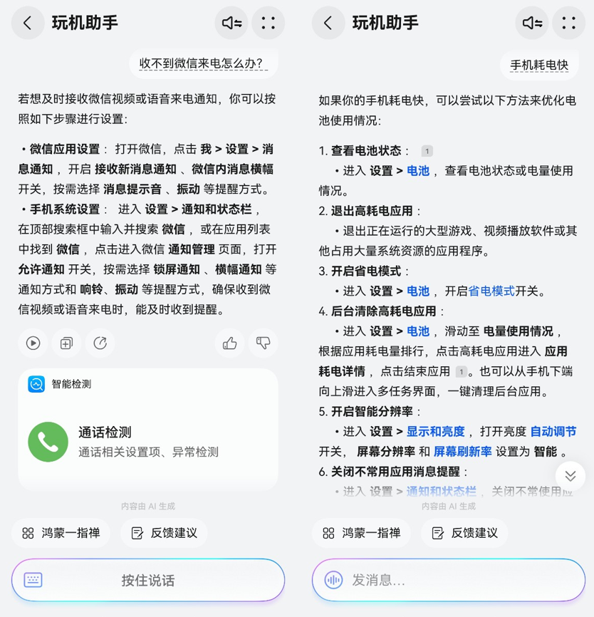 例如你问“收不到微信来电怎么办”,玩机助手会智能弹出一个“快捷通话检测”卡片。你只需轻轻一点,就能直接跳转到通话相关的设置项,一键进行异常检测与修复,从卡顿清理到电池优化,常见小毛病,自己就能快速搞定,省时又省心。