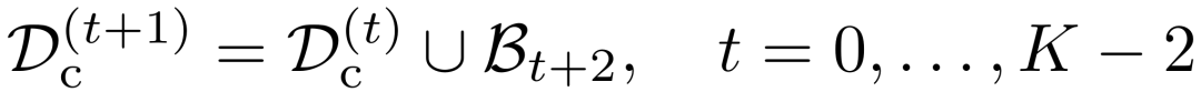 当前的训练子集 Dc 初始化为第一个桶 B1。训练过程中,每个更新阶段 t 将下一个桶合并到 Dc 中,以缓解灾难性遗忘: