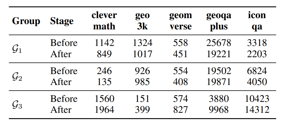 如表1所示,Re-AdaCuRL 在 Qwen2.5-VL-3B 和 7B 模型的数学推理任务上分别额外提升了 1.37% 和 1.03%。如表3所示,G1 组的样本减少而 G3 组的样本增加,这表明模型的数学推理能力得到了提升。为了更充分地利用数据集,研究团队采用更新后的策略重新评估题目难度并进行二次采样,基于重新采样的数据继续开展训练,从而进一步提升模型推理能力。