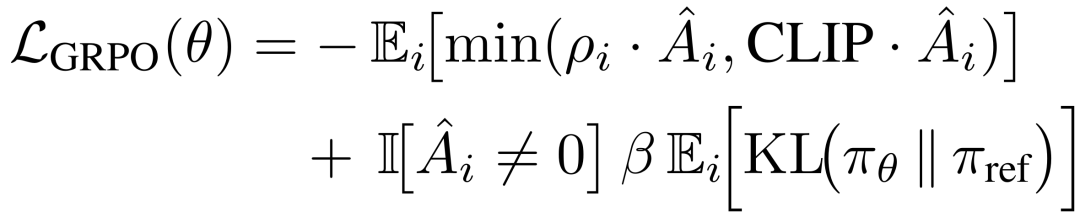 - 条件化KL计算。当某个rollout组内的所有奖励均为0或1时,从该组的损失计算中排除KL散度项,从而能够更有效地提升模型的推理能力。在AdaCuRL中,GRPO的损失函数定义如下:
