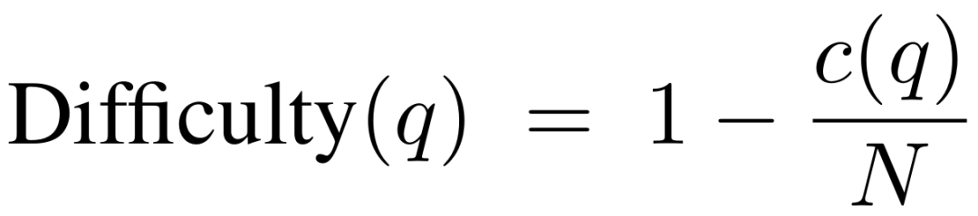 对于集合 S 中的每个问题,生成 N(N≫5)个答案,以进行精确的难度估计。令 c(q) 表示问题 q在这 N 次尝试中正确解的数量。将其难度得分定义为: