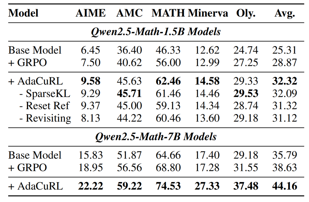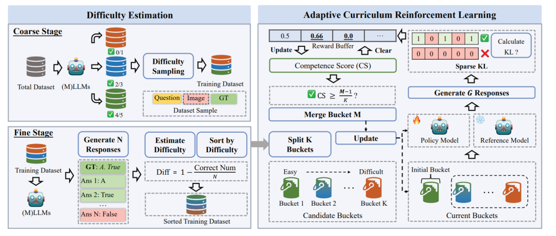 为解决上述问题,阿里的研究者们提出了一种自适应课程强化学习框架 AdaCuRL。该框架融合了由粗到精的难度评估机制与自适应课程调度策略,动态对齐数据难度与模型能力,并引入数据重温机制以缓解灾难性遗忘。此外,AdaCuRL采用自适应参考策略与稀疏KL策略来预防策略退化。在多个推理基准上的大量实验表明,AdaCuRL 在LLMs和MLLMs上均取得显著的性能提升。