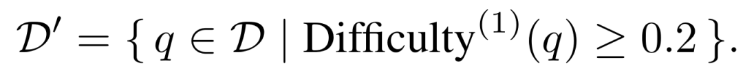 使用更新的策略模型 πθ对由粗到细的难度评估进行重新校准,并在采样过程中过滤掉已在前一轮训练过的数据。将Difficulty(1)(q) 表示为重新估计的难度得分。为保留已获得的推理能力,在第二轮迭代中丢弃难度得分低于阈值(例如 0.2)的样本: