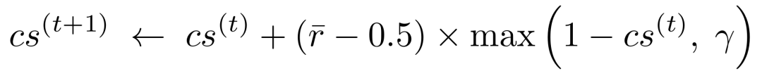 是最近 M 个训练样本的平均奖励,max(1−cs,γ) 作为更新步长的衰减因子。随着 cs 增大,更新步长会逐渐变小,模拟人类学习过程中在更难的数据上花费更多时间,而 γ 则防止更新速率变得过小。