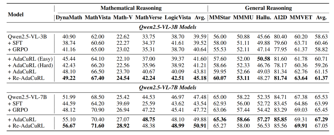 表1和表2全面比较了不同方法在MLLMs和LLMs上的各类推理基准表现。可以发现,无论是在多模态模型还是纯语言模型上,AdaCuRL 在所有基准测试和不同模型规模下均优于基线方法。