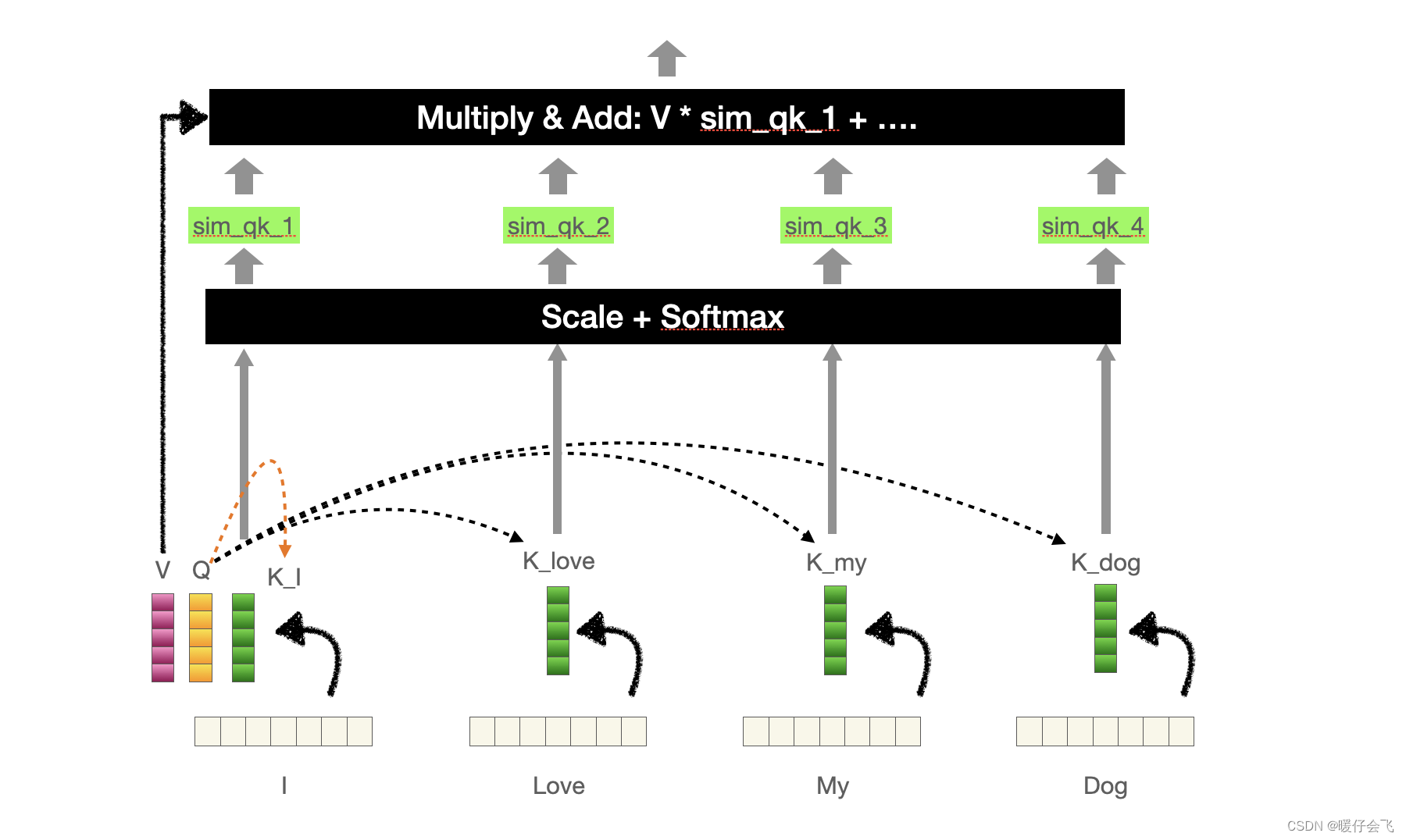 最终还要再用 v 向量再去和每一个生成的相似度权重 sim_qk_nsim\_{qk}\_nsim_qk_n (每一个都是标量)相乘之后相加,得到一个最终的向量。这个最终的向量编码了 I 和其他词向量的关系