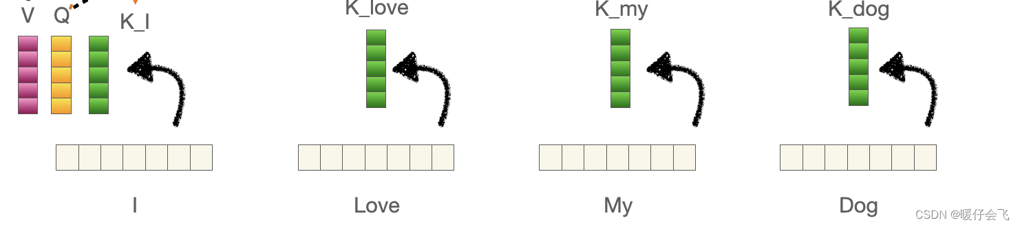 - 当然,除了III 之外的单词也会产生 qqq 向量,只是这里我们先看 III 这个单词,所以先将 III 当做主角,其他单词的 qqq 向量也是同样的作用,如法炮制