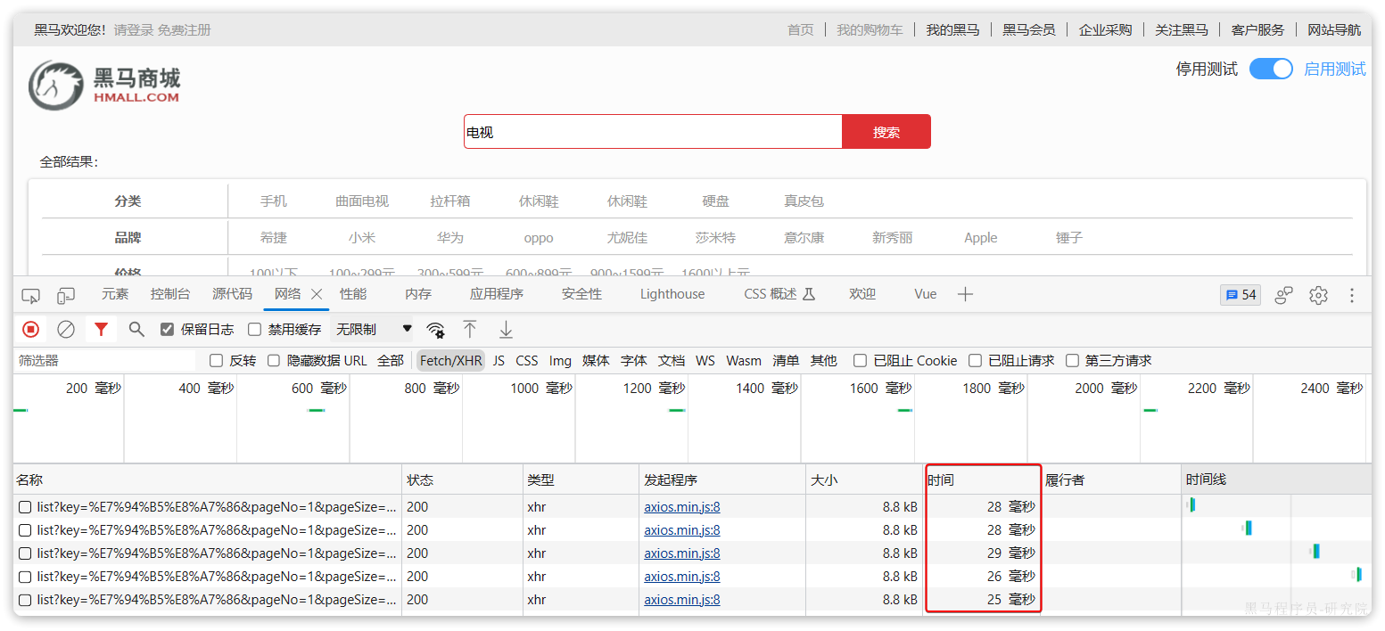 由于数据库模糊查询不走索引,在数据量较大的时候,查询性能很差。黑马商城的商品表中仅仅有不到9万条数据,基于数据库查询时,搜索接口的表现如图: