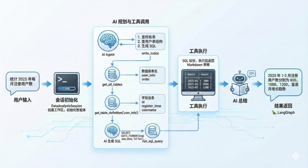 本文详细介绍如何使用LangChain团队推出的DeepAgents框架构建MySQL数据分析助手。文章阐述了DeepAgents的核心能力(任务规划、工具调用等)及在数据分析中的优势,深入解析了基于会话的分层架构设计和工具调用实现原理,包括获取表名、表结构、执行SQL等核心功能。通过完整的环境配置、代码实现和Agent Chat UI可视化调试指南,帮助开发者快速搭建企业级数据分析助手,实现从查询到分析的自动化流程。