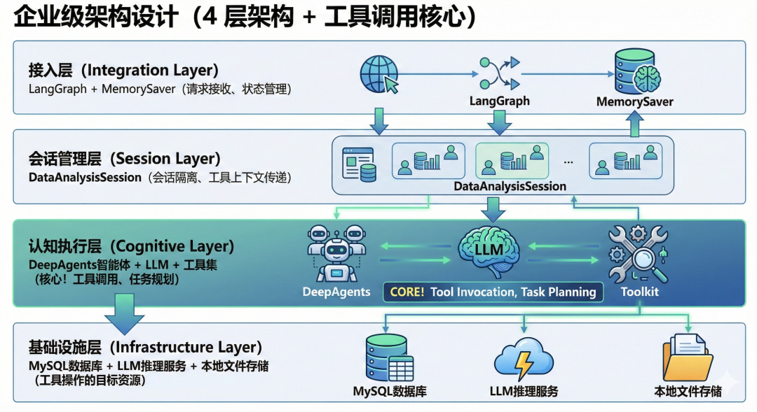 DeepAgents 是 LangChain 团队重磅推出的 Python 框架,专为构建「深度代理」而生——基于 LLM 驱动,具备任务规划、子代理委托、文件系统访问、持久化内存四大核心能力,能轻松应对复杂多步骤任务。而数据分析恰好是这类框架的绝佳应用场景:从查表结构、写SQL,到分析结果,每个环节都是可拆解的步骤,且需要工具与数据的深度交互。